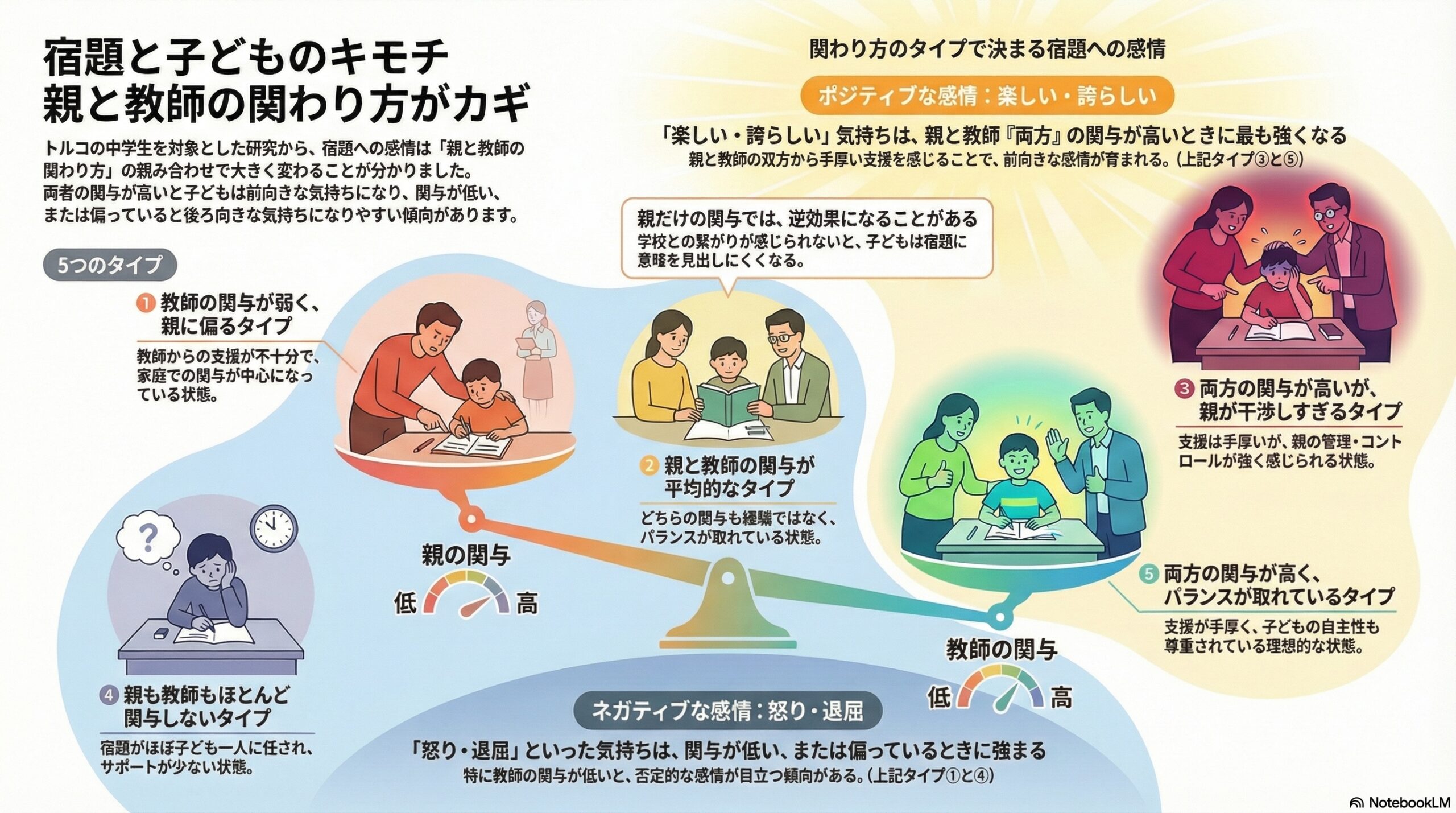 - 親だけ多くて教師の関与が少ないと否定的な感情が出やすく、関わり方のバランスが大切だとされている。