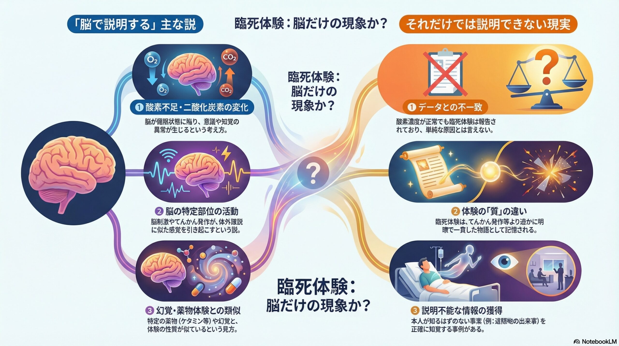 - 脳中心の統合モデルは評価される一方で、臨死体験のすべてを説明できるとは限らず、今も未解明の部分が残る、と結んでいる。