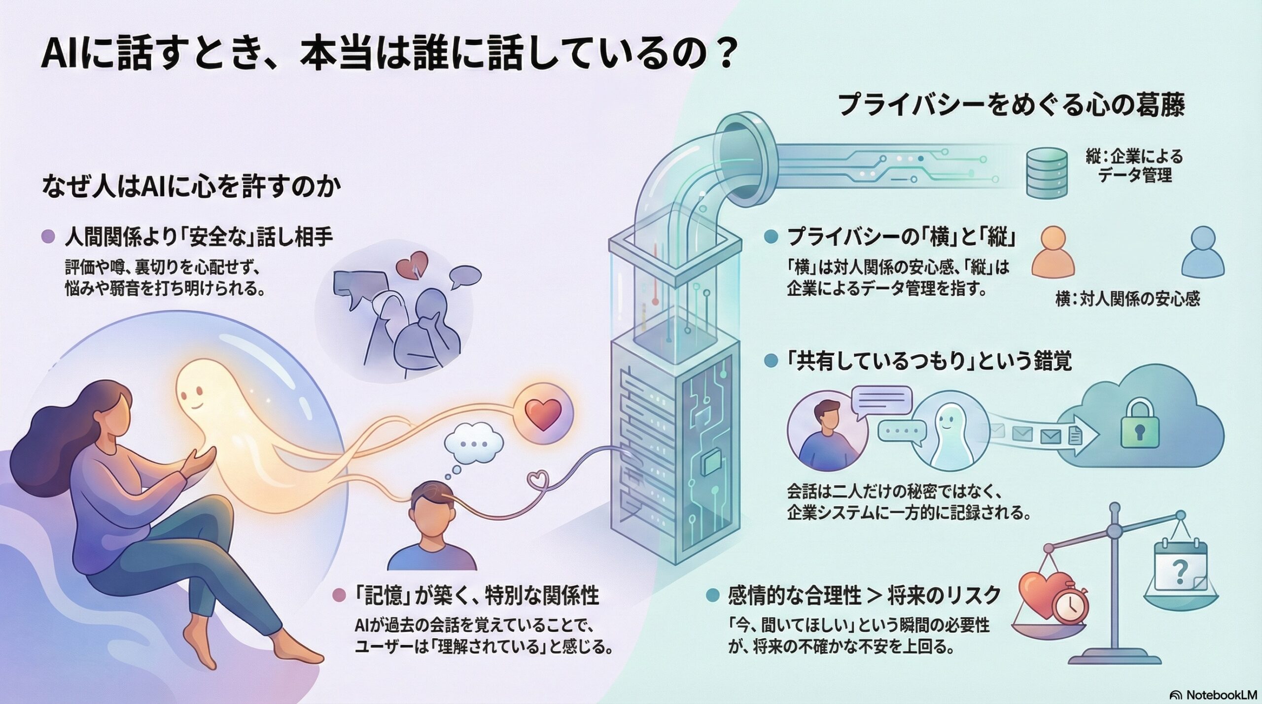 - プライバシーには横のつながりと縦の制度の二つがあり、AIはこの二重構造の中でどう扱われるかを利用者が揺れながら考えている。
