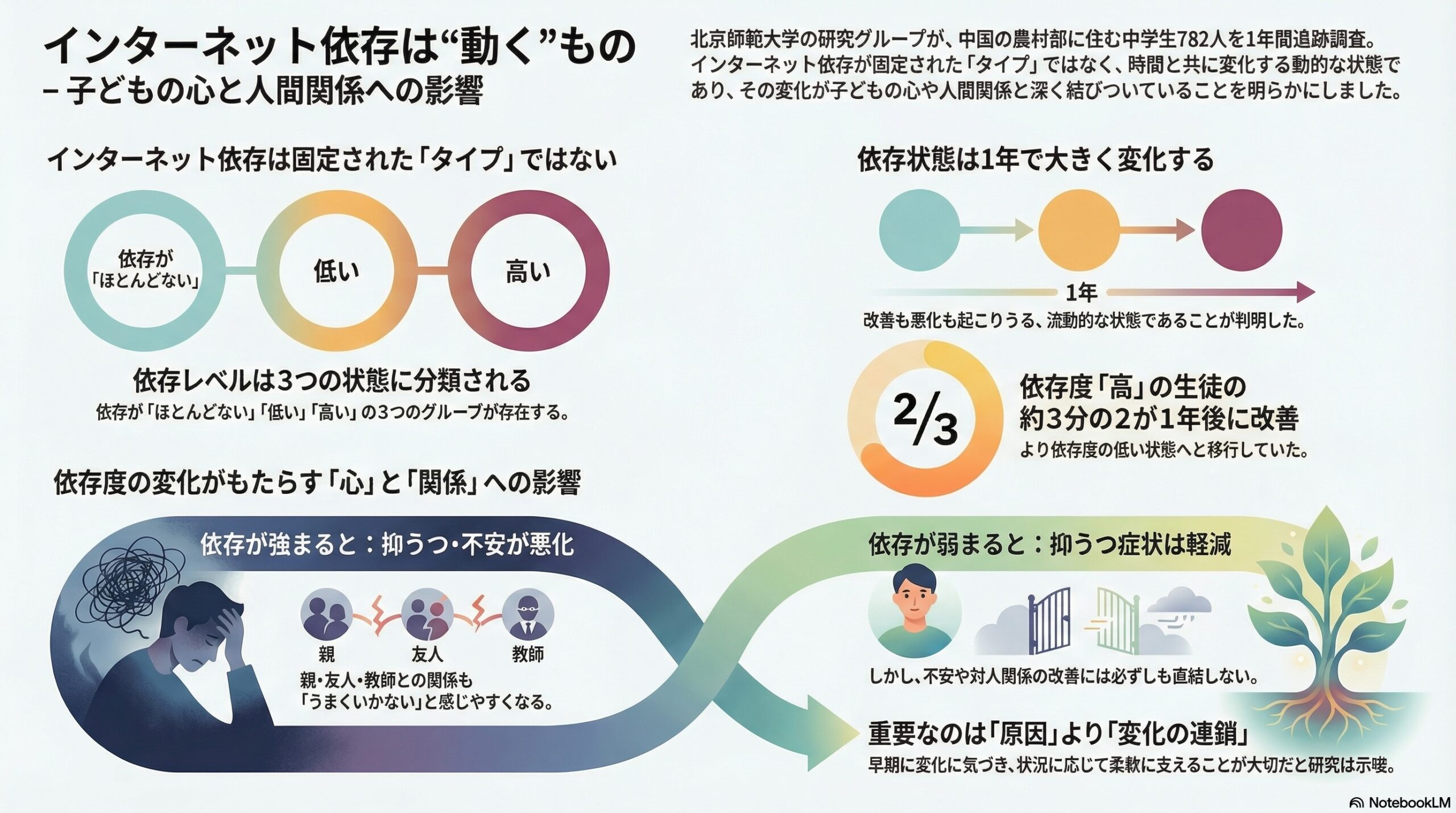 一方で、インターネット依存の変化が、その後の心の状態や人間関係と結びついていることは、比較的はっきりと示されました。