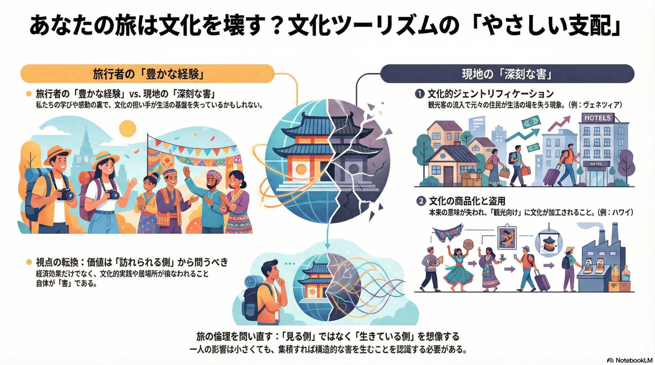 この逆説的な状況が、文化ツーリズムの核心的な問題として描かれます。