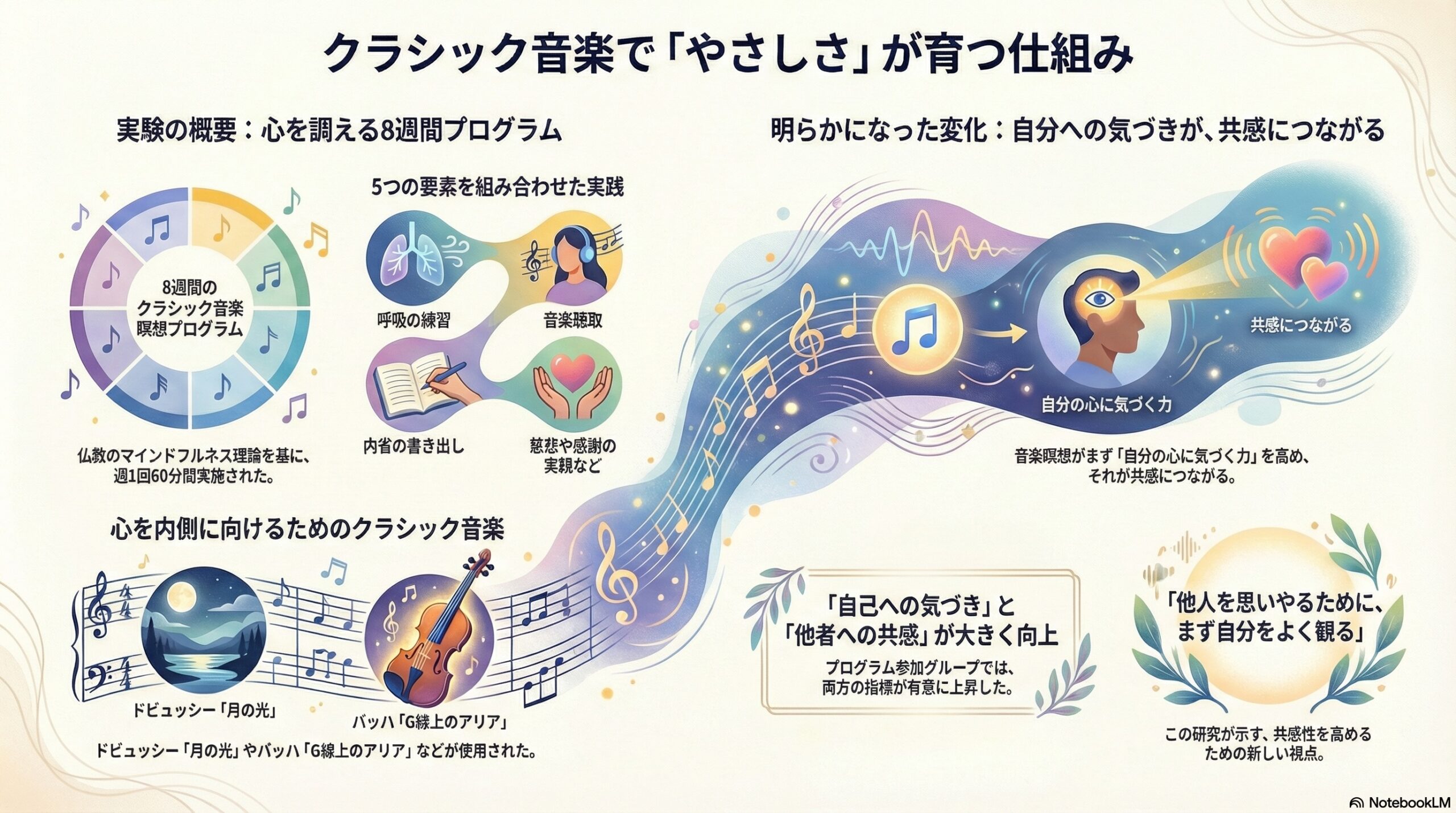 - 8週間のクラシック音楽瞑想プログラムで、メタ認知的気づきと共感性が高まる可能性が示された。