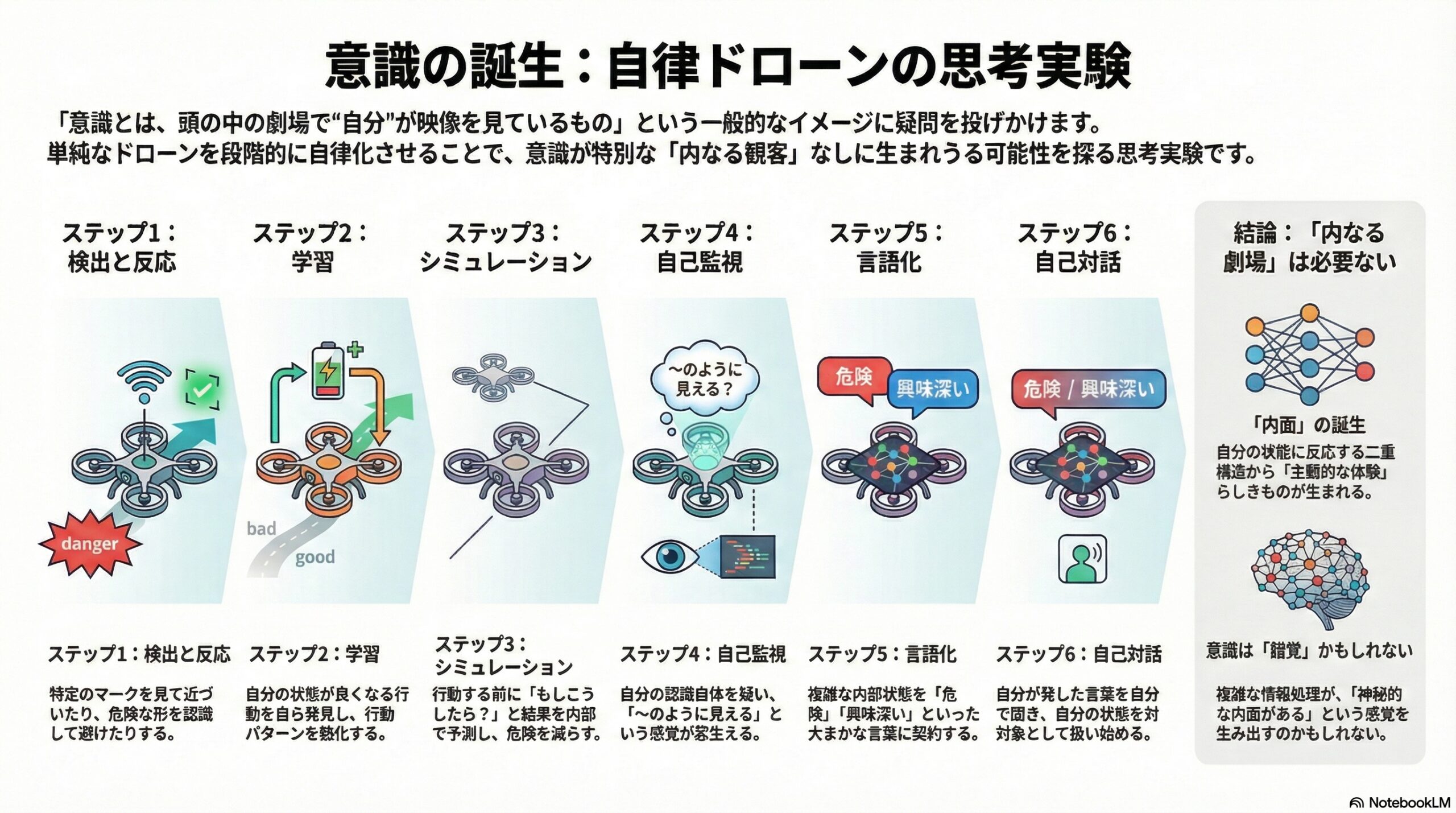 - 下から積み上げるドローンの思考実験で、意識がどう生まれるかを考える。