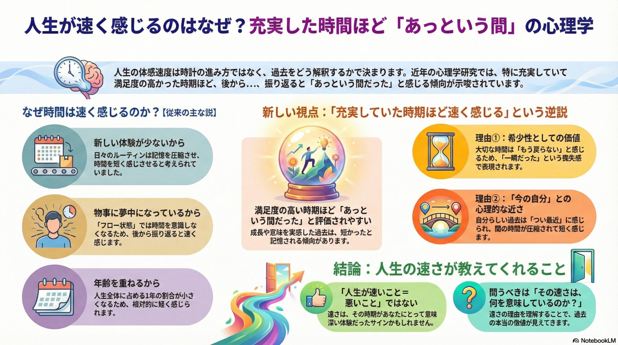 • 充実していた時期ほど「一瞬だった」と感じやすく、希少性や今の自分につながる感覚が速さを生み出す理由として挙げられる。