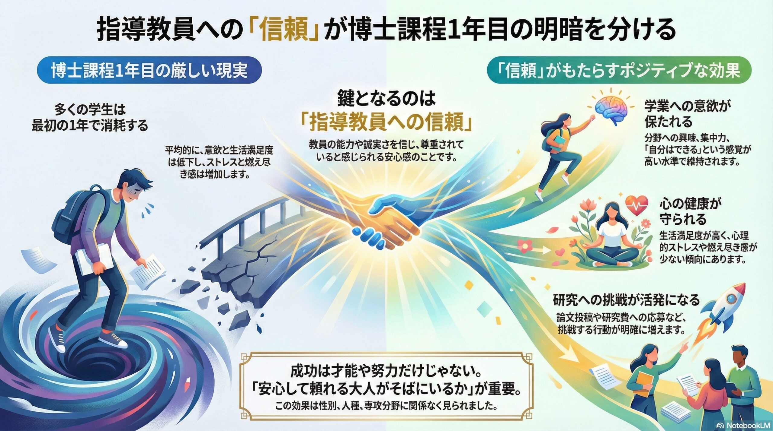 では、この関係性の中でも、**「指導教員を信頼できるかどうか」**は、学生のその後にどれほど影響するのでしょうか。