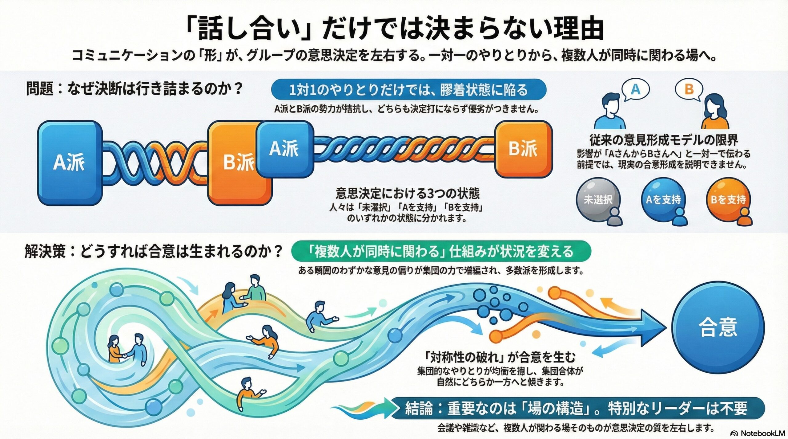 人が集団で何かを決めるとき、私たちはしばしば「話し合えば自然に結論が出る」と考えがちです。