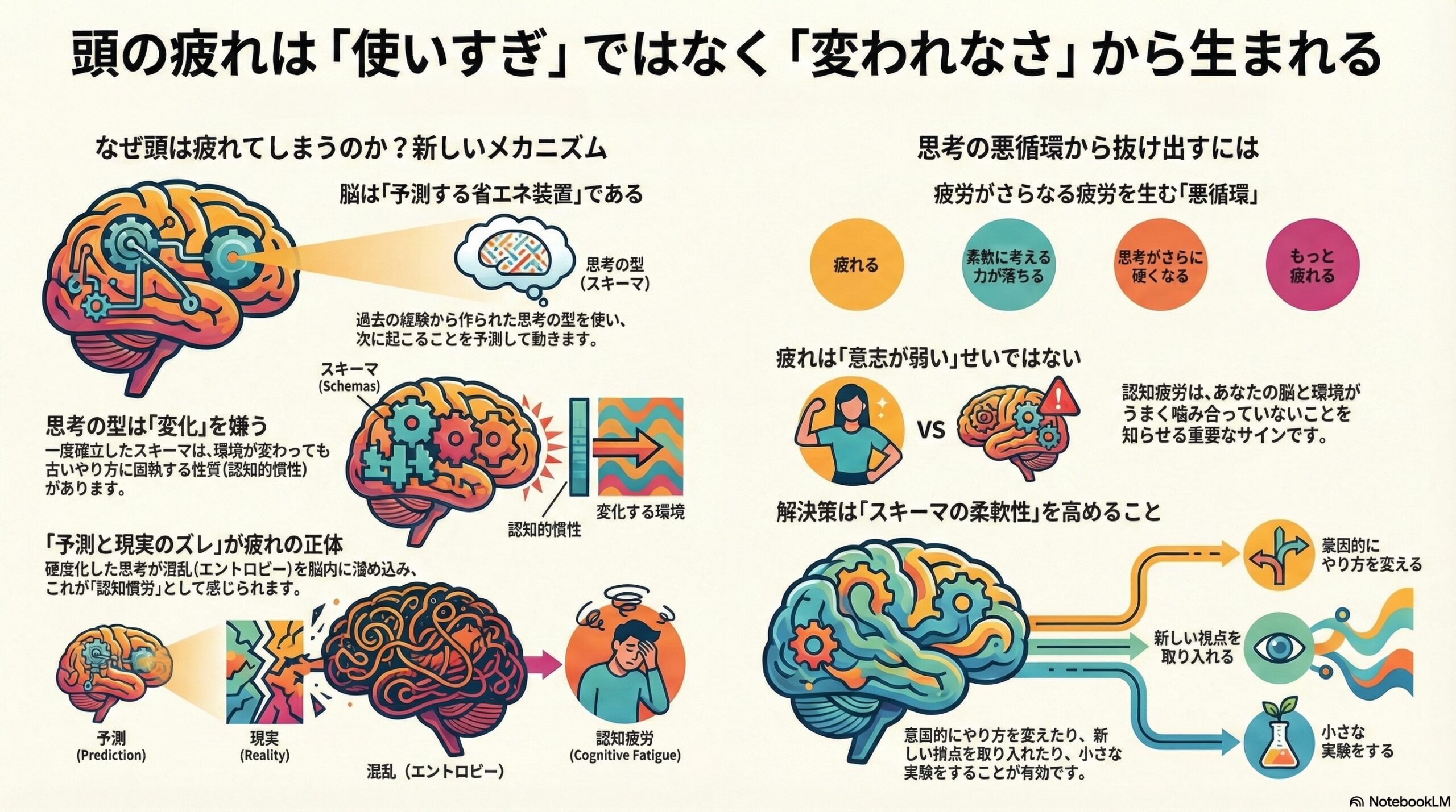 - 脳は予測を作る装置で、スキーマが硬くなると現実とずれやすくなり、エントロピーが高まって疲れがたまる。