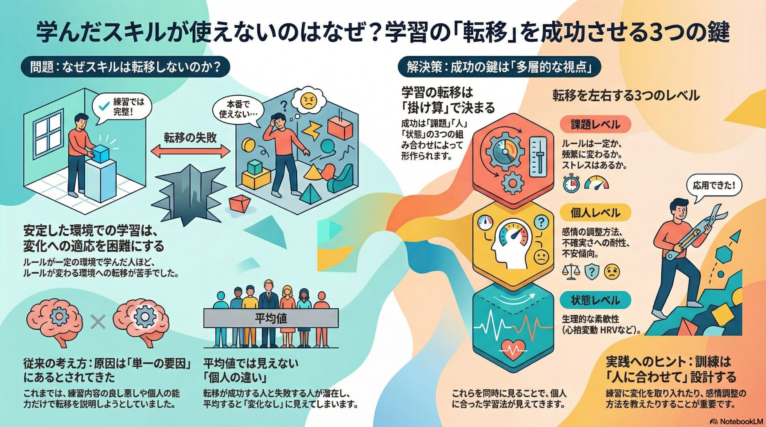 - 研究は、学習を人と環境に合わせて設計することが大事だと示しています。