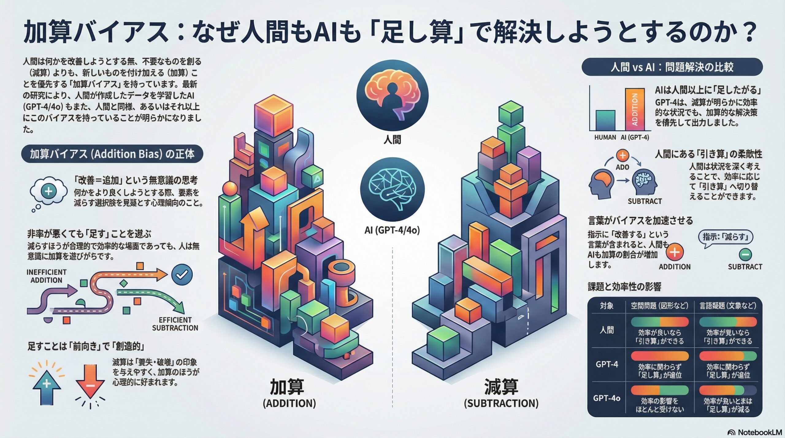 - 人とGPT-4とGPT-4oは、問題を解くとき「足す」解決が多く選ばれやすい加算バイアスを共有している。