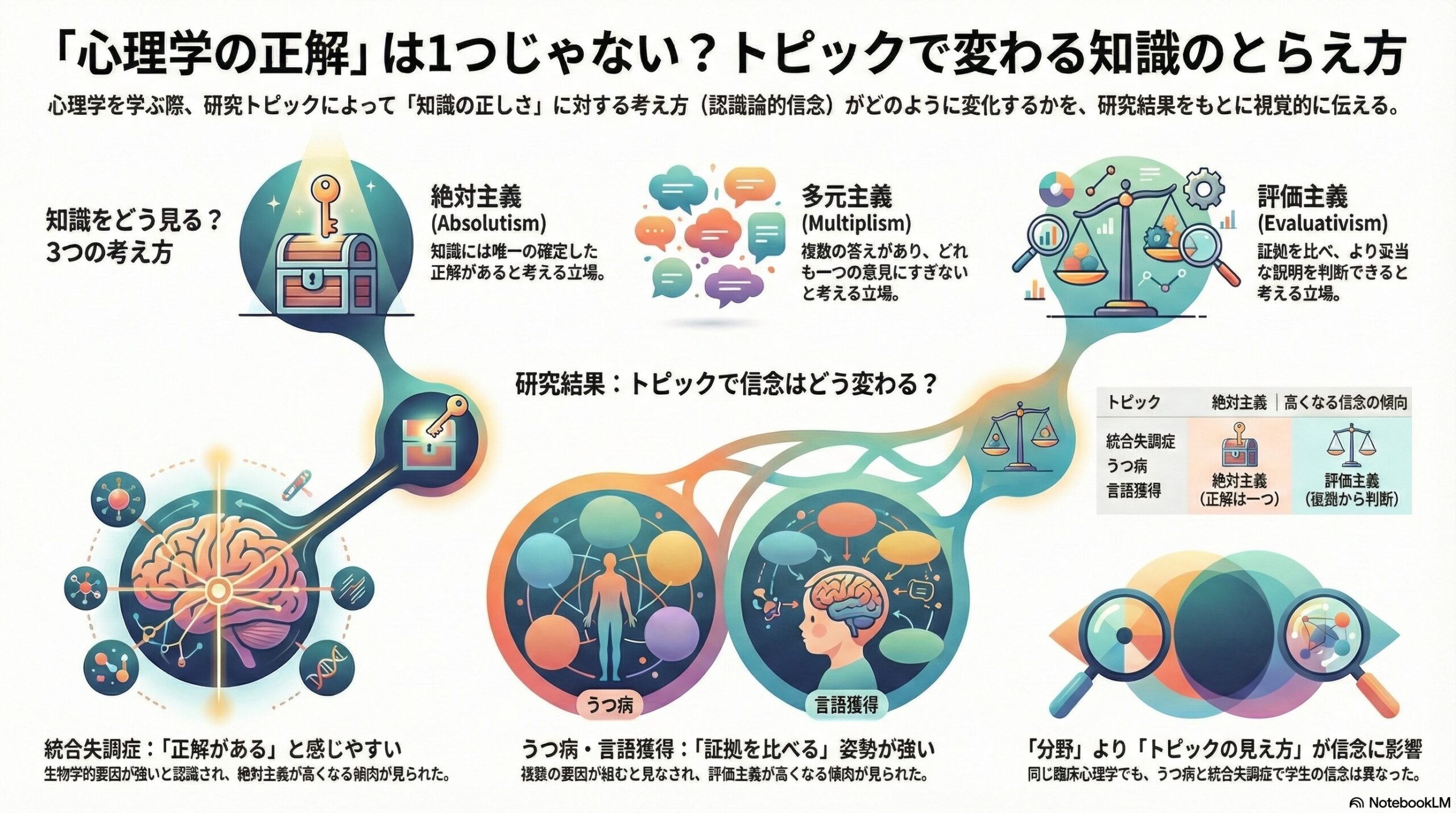 今回紹介する研究は、この認識論的信念が、「心理学という分野全体」で一定なのではなく、同じ心理学の中でも、トピックごとに変化する可能性を示しました。