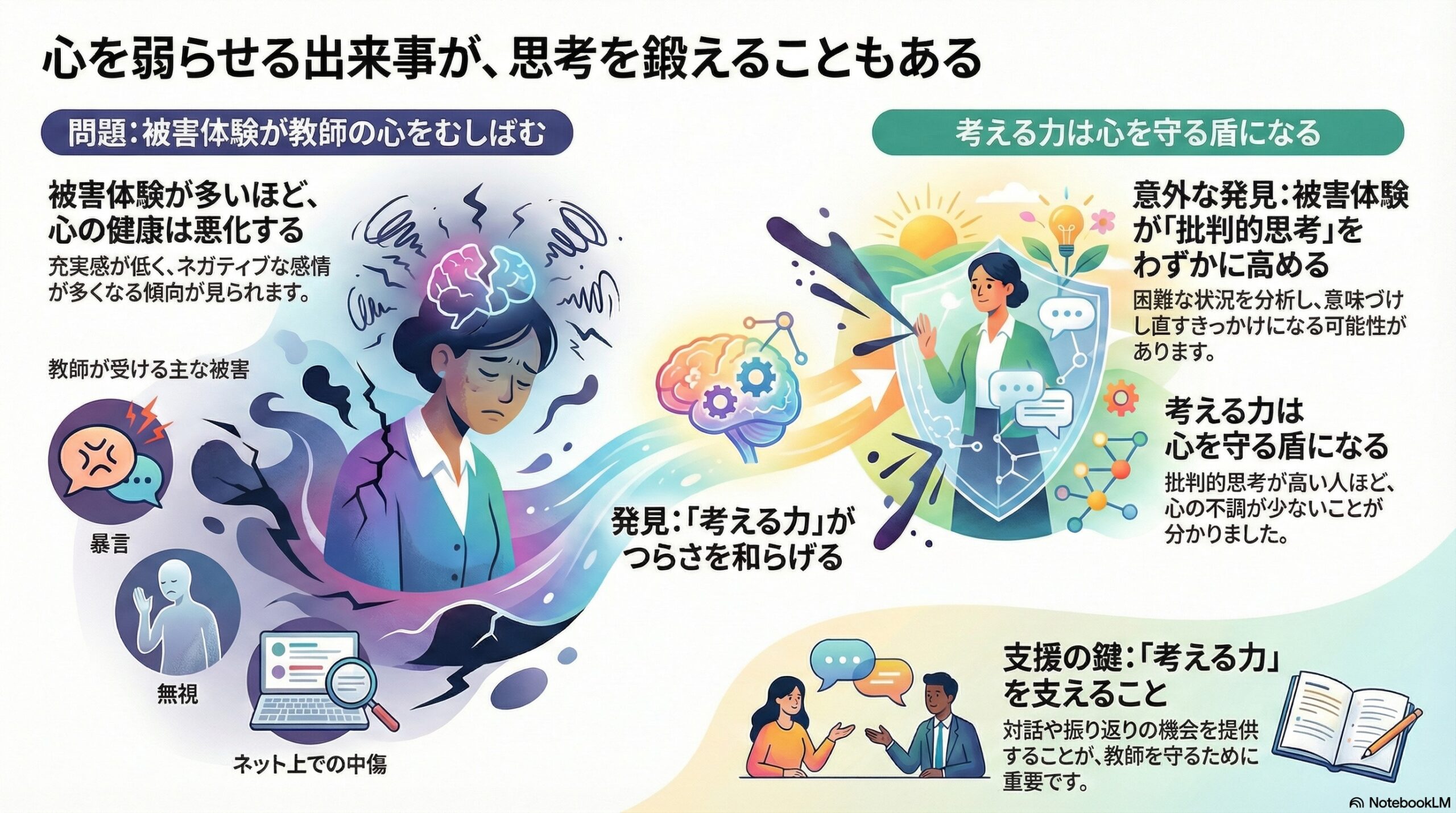 この結果は、「被害体験が教師の心の健康を損なう」というこれまでの研究結果と一致しています。