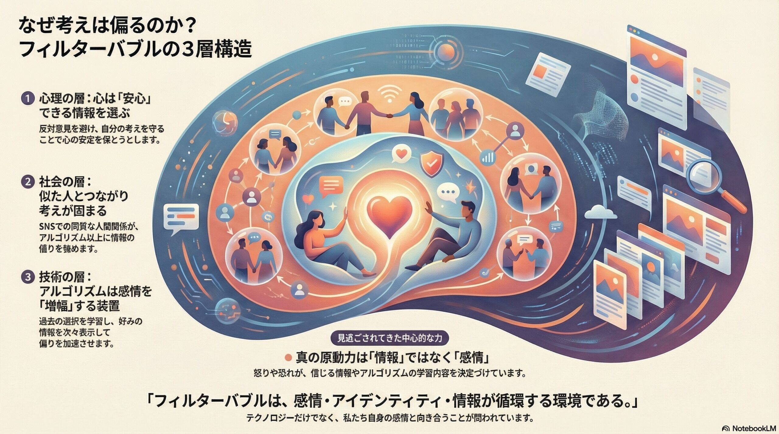 - フィルターバブルは心の安心を求める心理の層と、似た人とつながる社会の層と、過去の行動を学んで情報を増幅する技術の層が重なると起きるものだ。