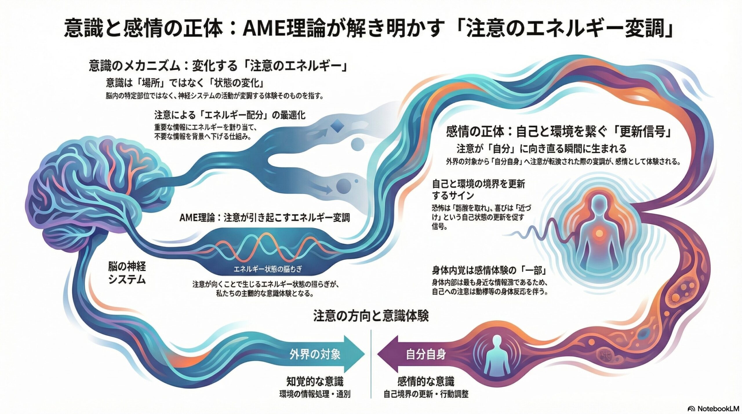 - AME理論は、意識と感情を「注意によるエネルギー変調」の現れとして説明する。