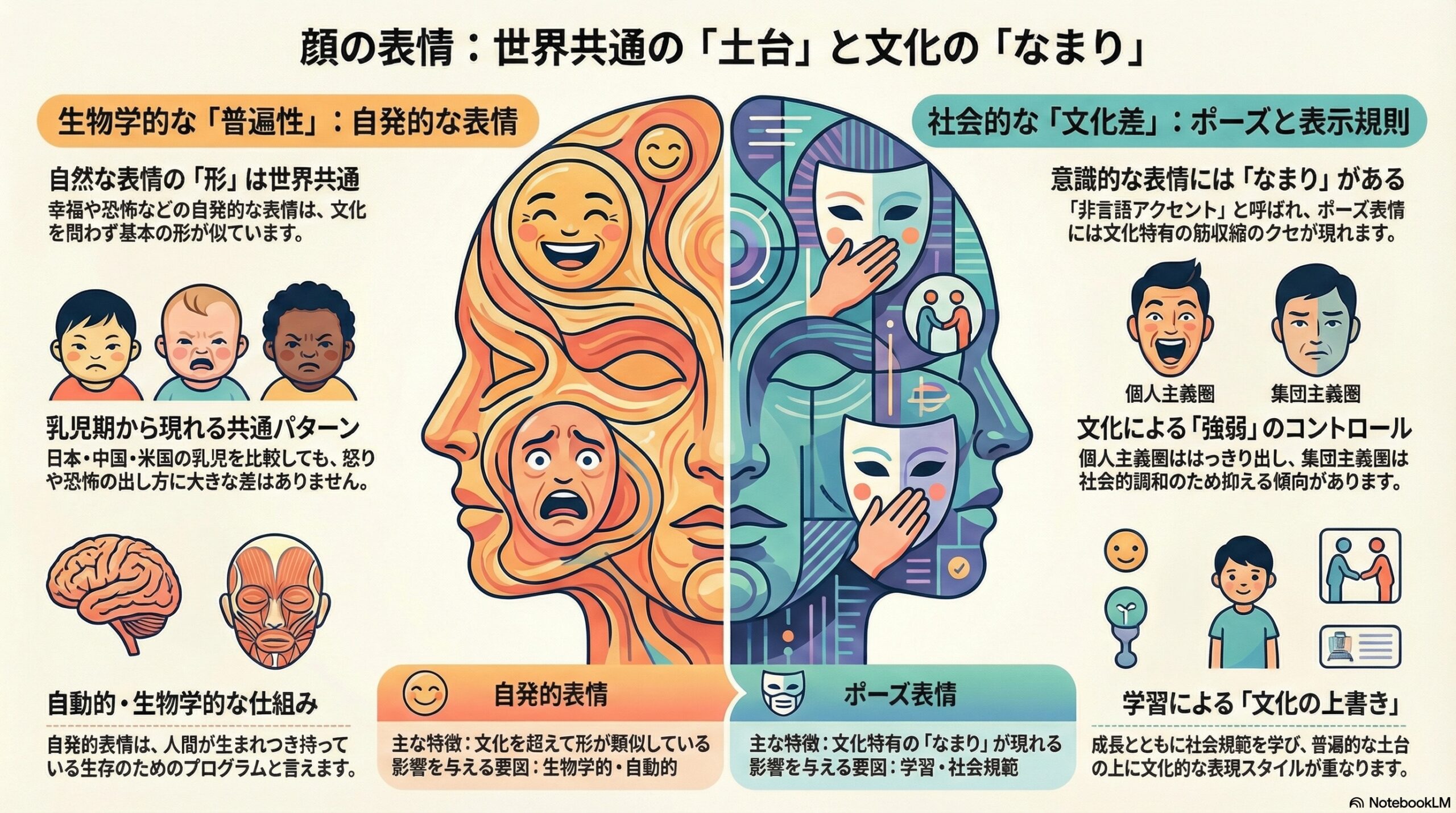 - 普遍と文化は二層構造で、生物学的基盤に文化的ルールが重なると考えられている。
