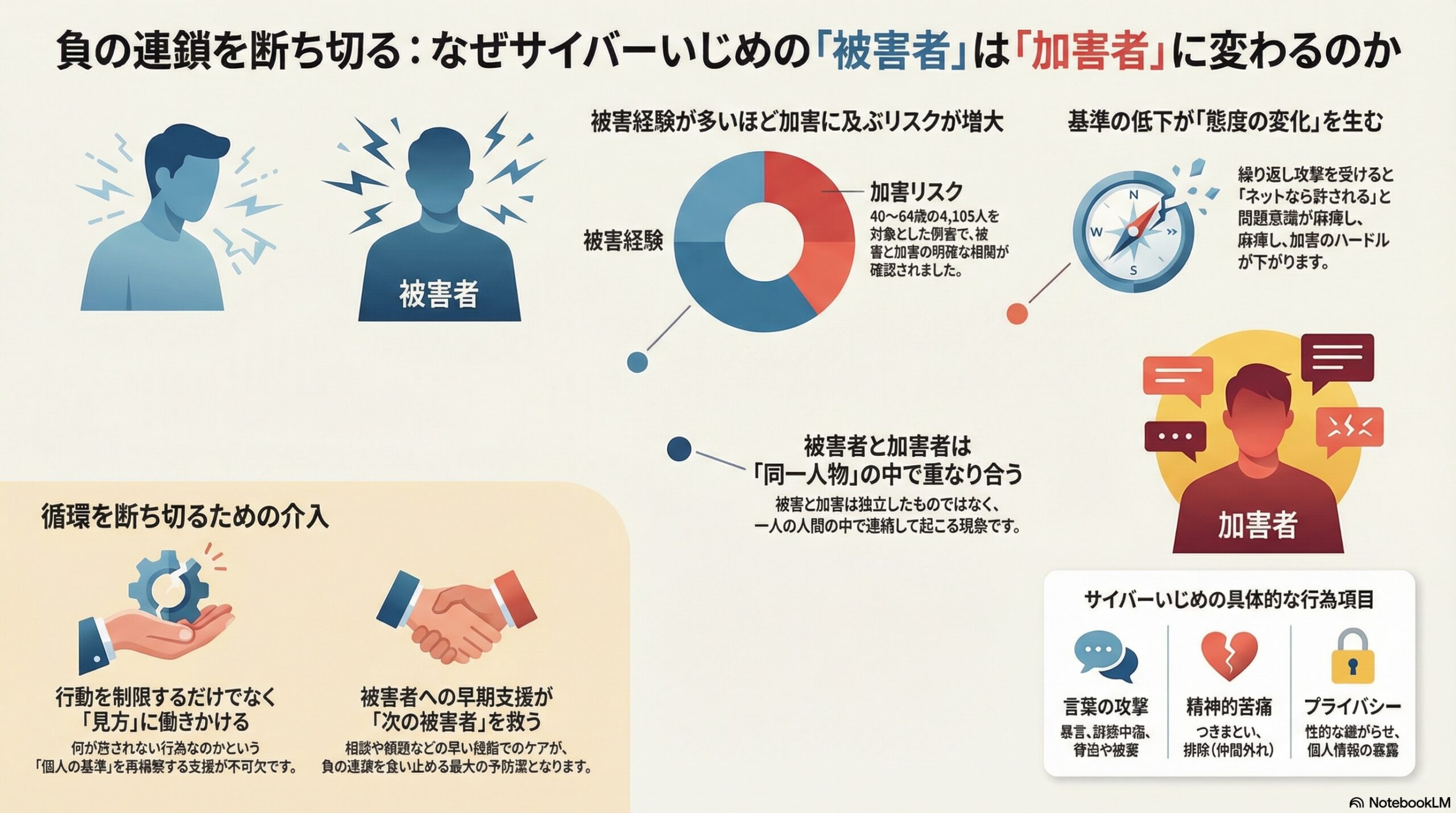 • 早い支援と見方の改善が、被害の連鎖を止める可能性がある。