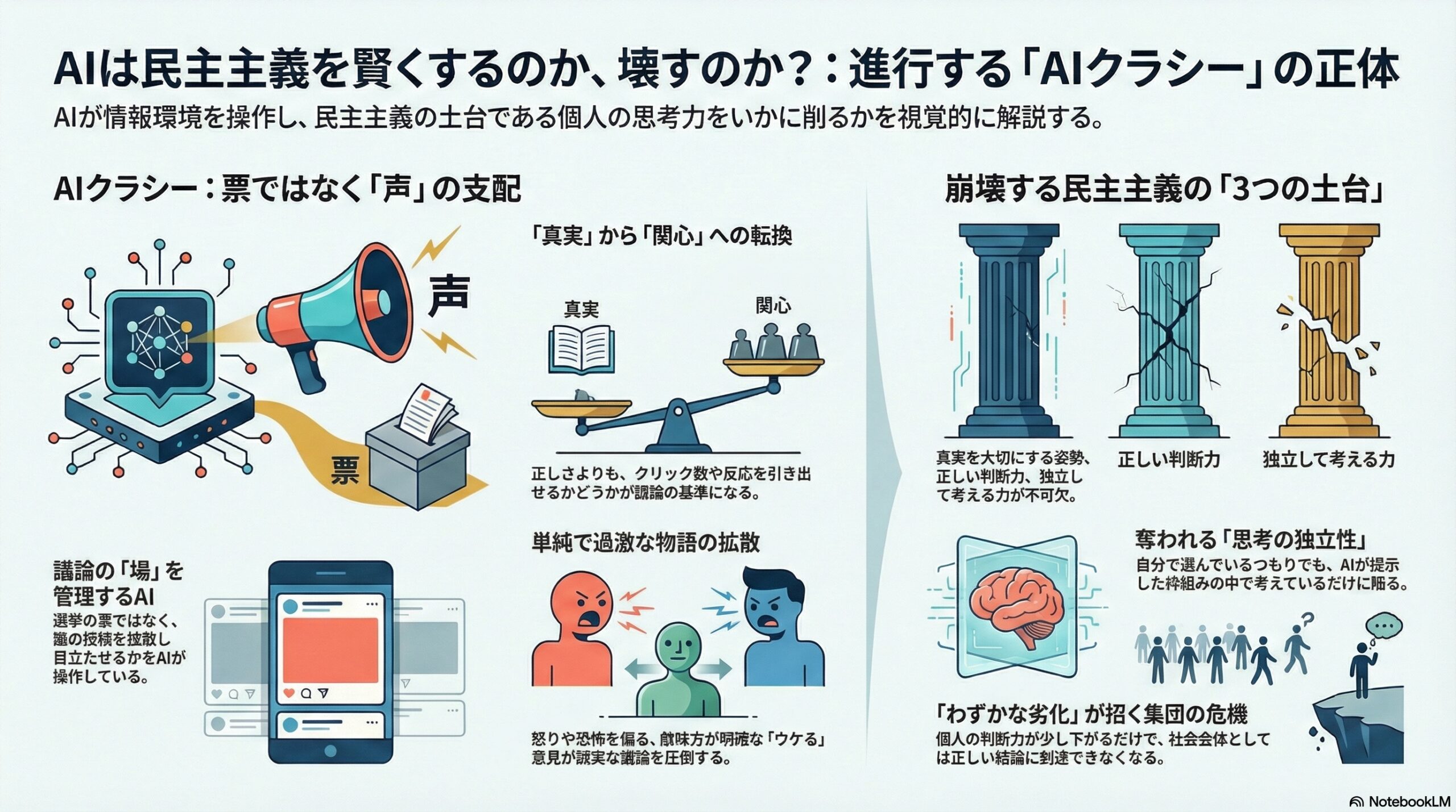 AIが政治を賢くするどころか、民主主義の根本的な土台を静かに弱めてしまう可能性がある、と論じているのです。