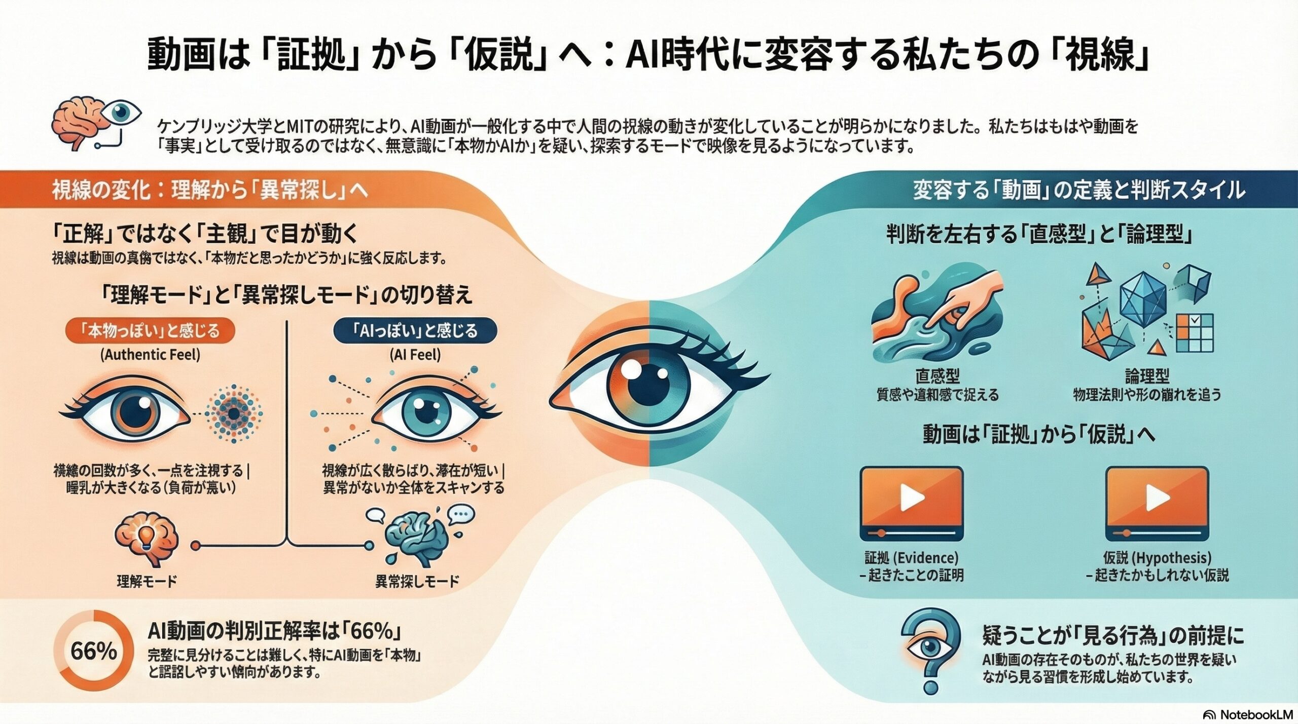 • ケンブリッジ大学とMITの研究で、AI動画が増える時代に人が映像をどう見るかを調べた。
