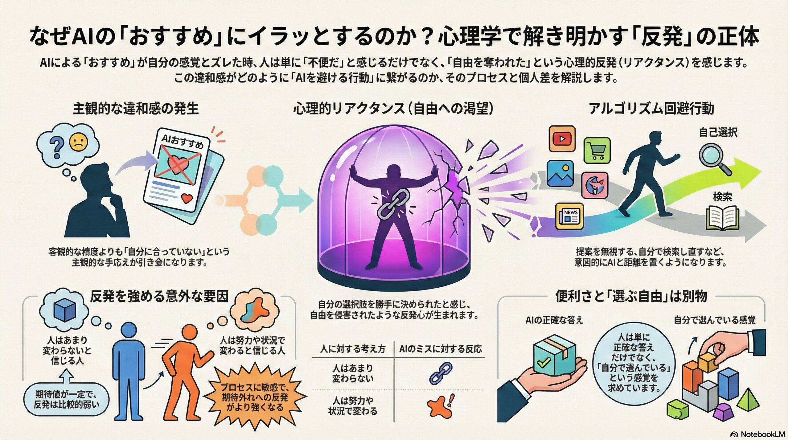 - その反発は心理的リアクタンスと呼ばれ、アルゴリズムを信用せず自分で探す・提案を無視する行動に現れる。