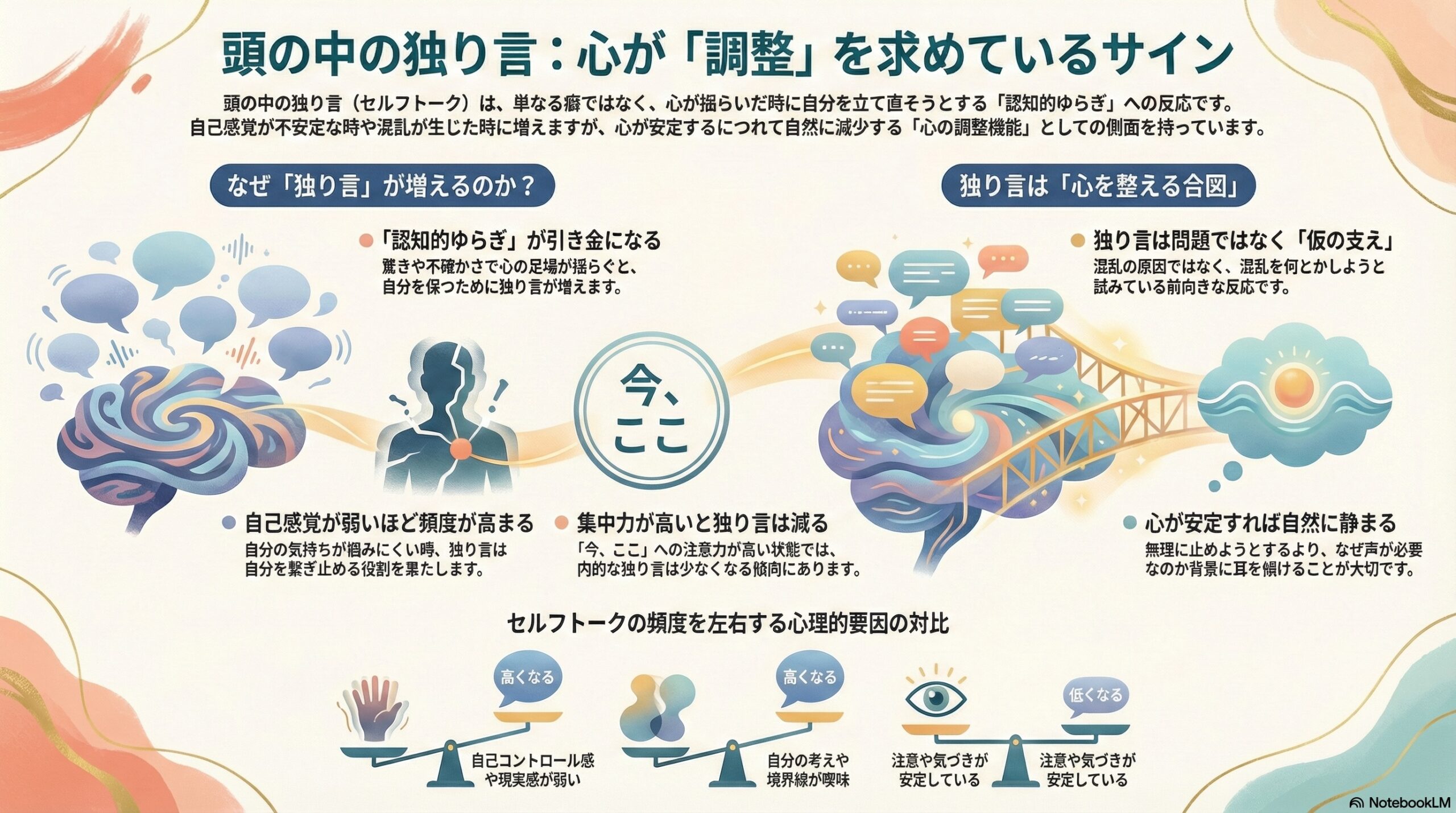 注意が今ここに向き、自己感覚が安定しているとき、セルフトークは自然と少なくなります。