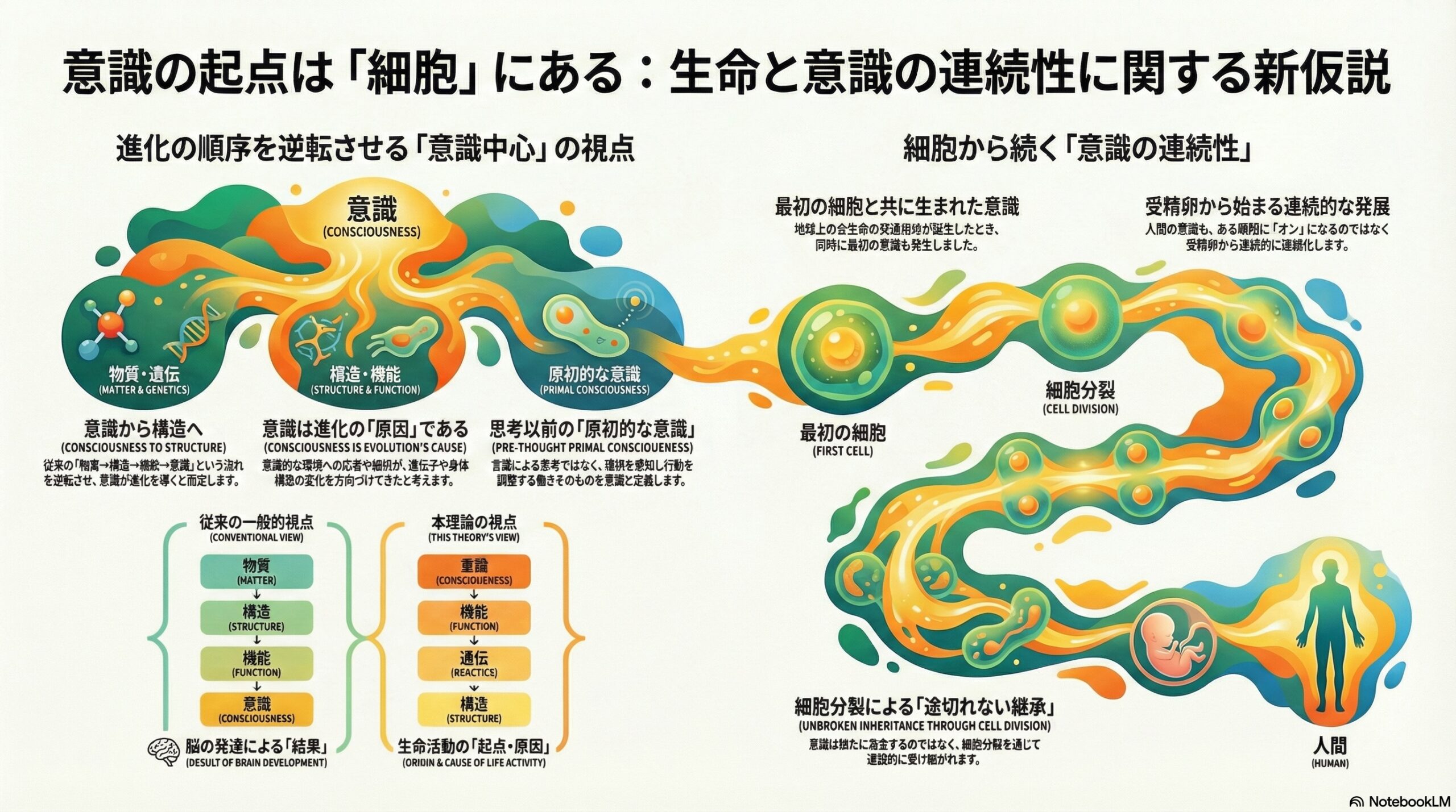 - 意識は脳だけのものではなく、生命が生まれたときから始まり、途切れずに受け継がれてきたという仮説が述べられている。