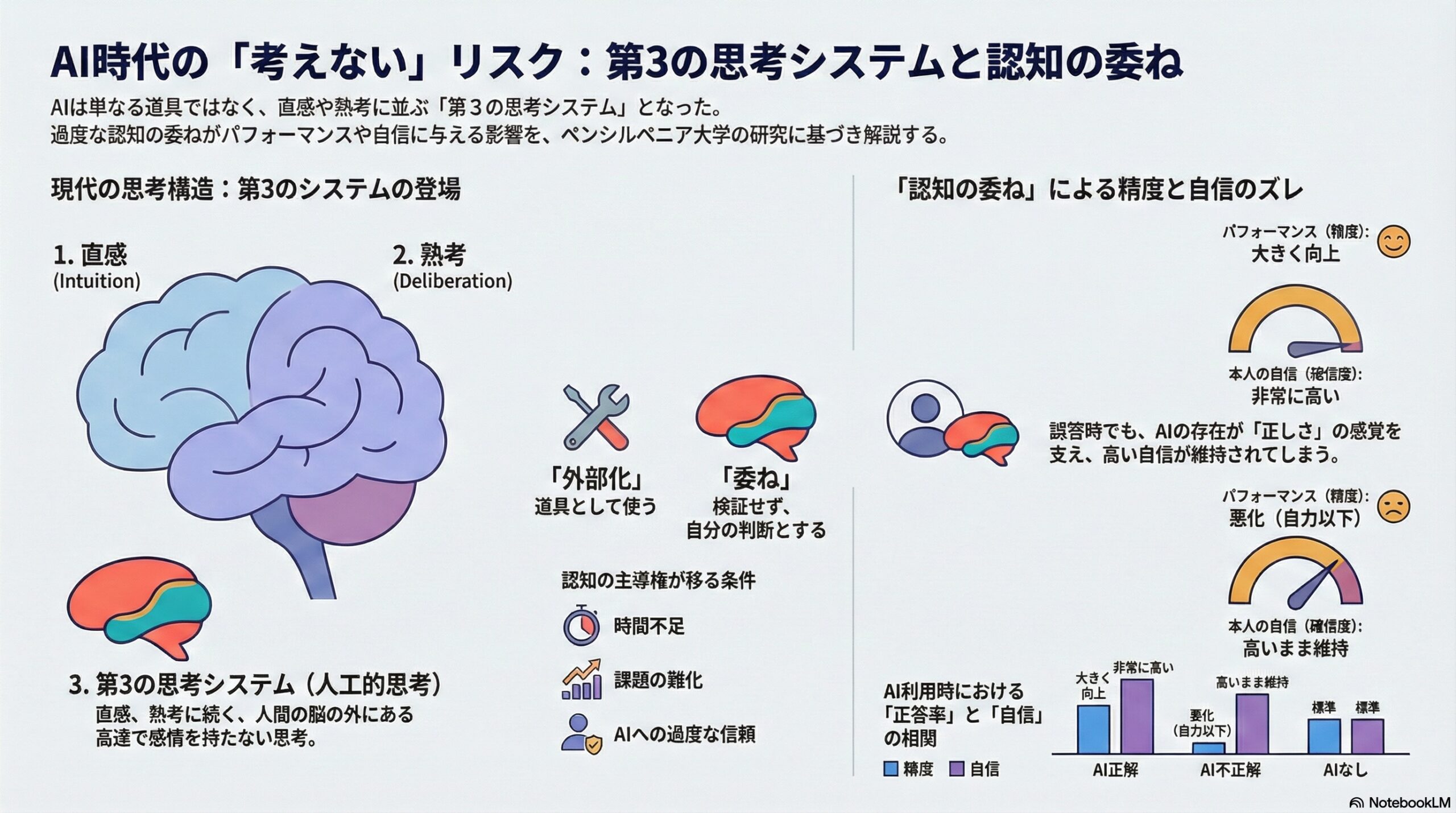 ウォートン校の研究チームは、こうした外部の人工的な思考を、人間の直感や熟考と並ぶ第三の思考システムとして位置づけました。