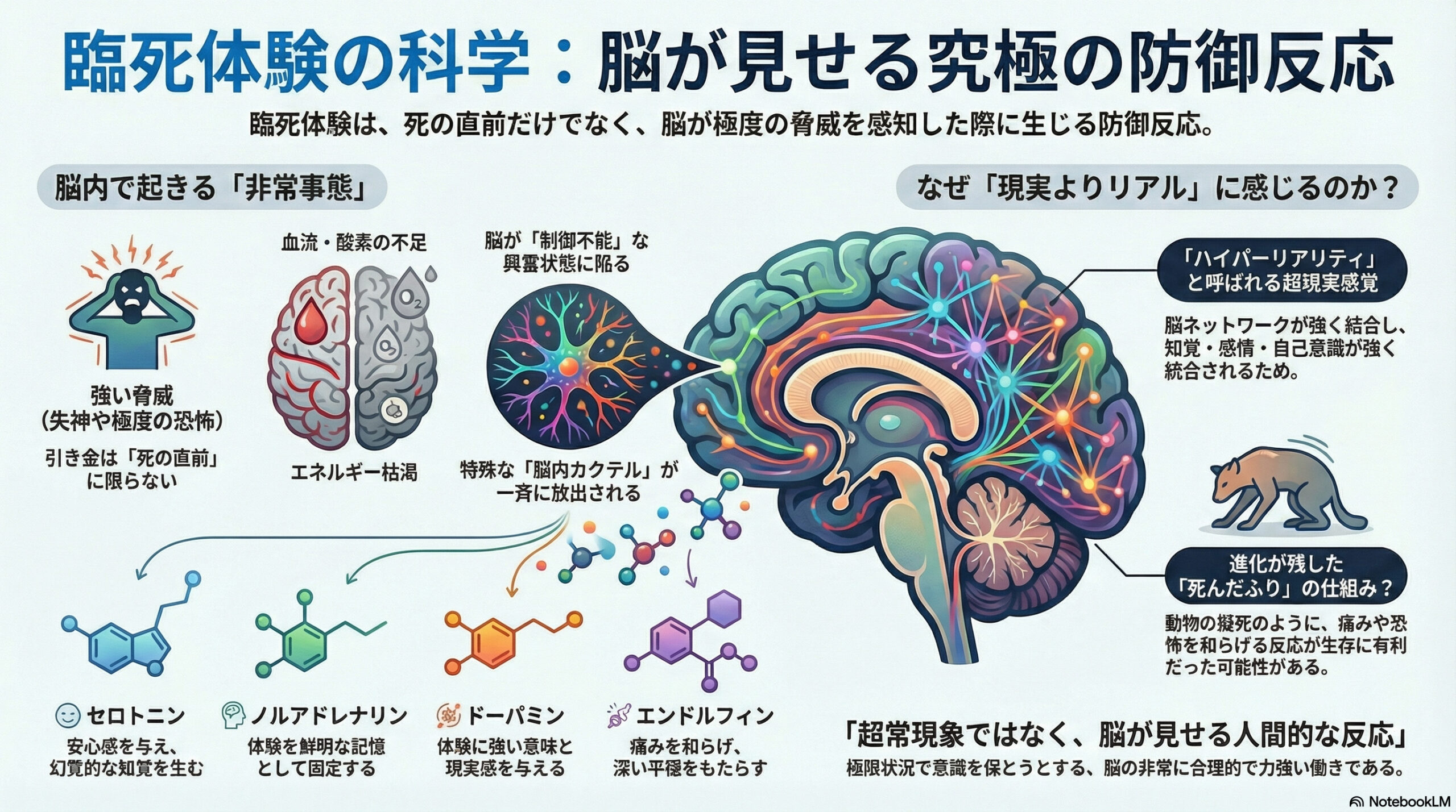 この論文は、そうした知見を統合し、臨死体験を「偶然の幻覚」でも「超自然現象」でもなく、進化的に保存された脳の反応が重なって生じる現象として捉え直しています。