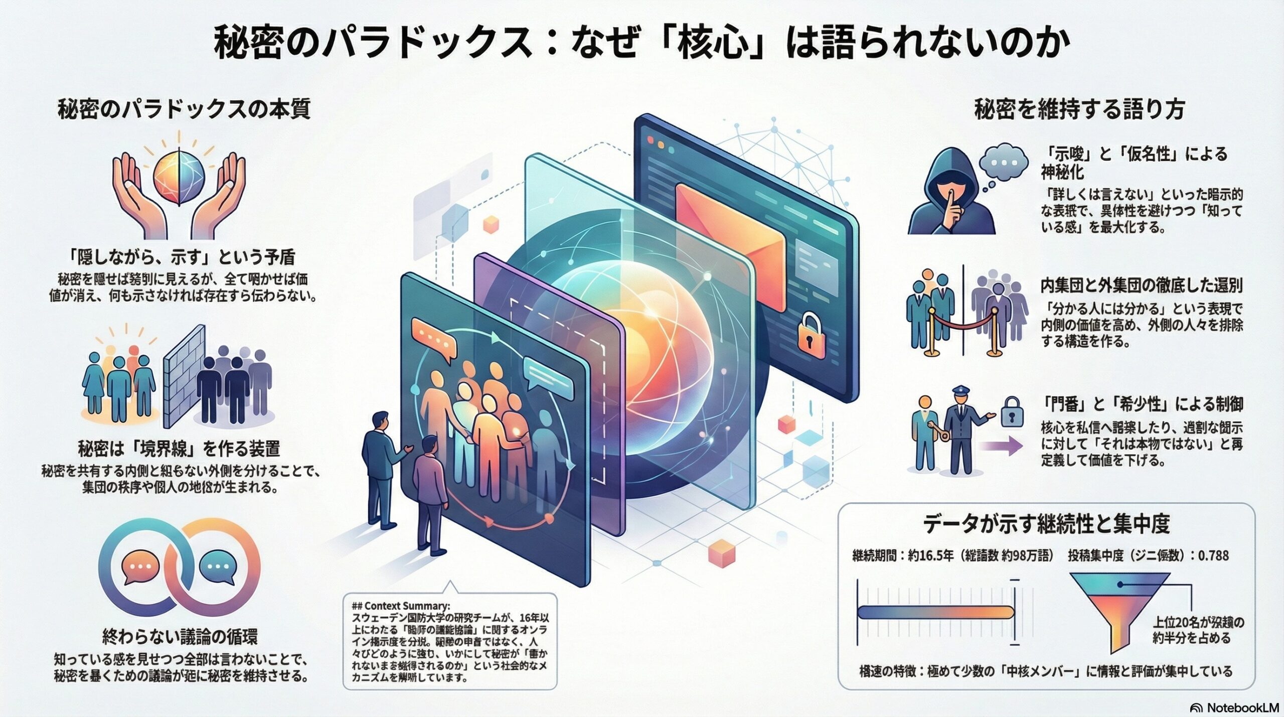 研究は、秘密のパラドックスが単なる心理的欲求ではなく、コミュニティが自己組織化するための実践になりうると結論づけます。