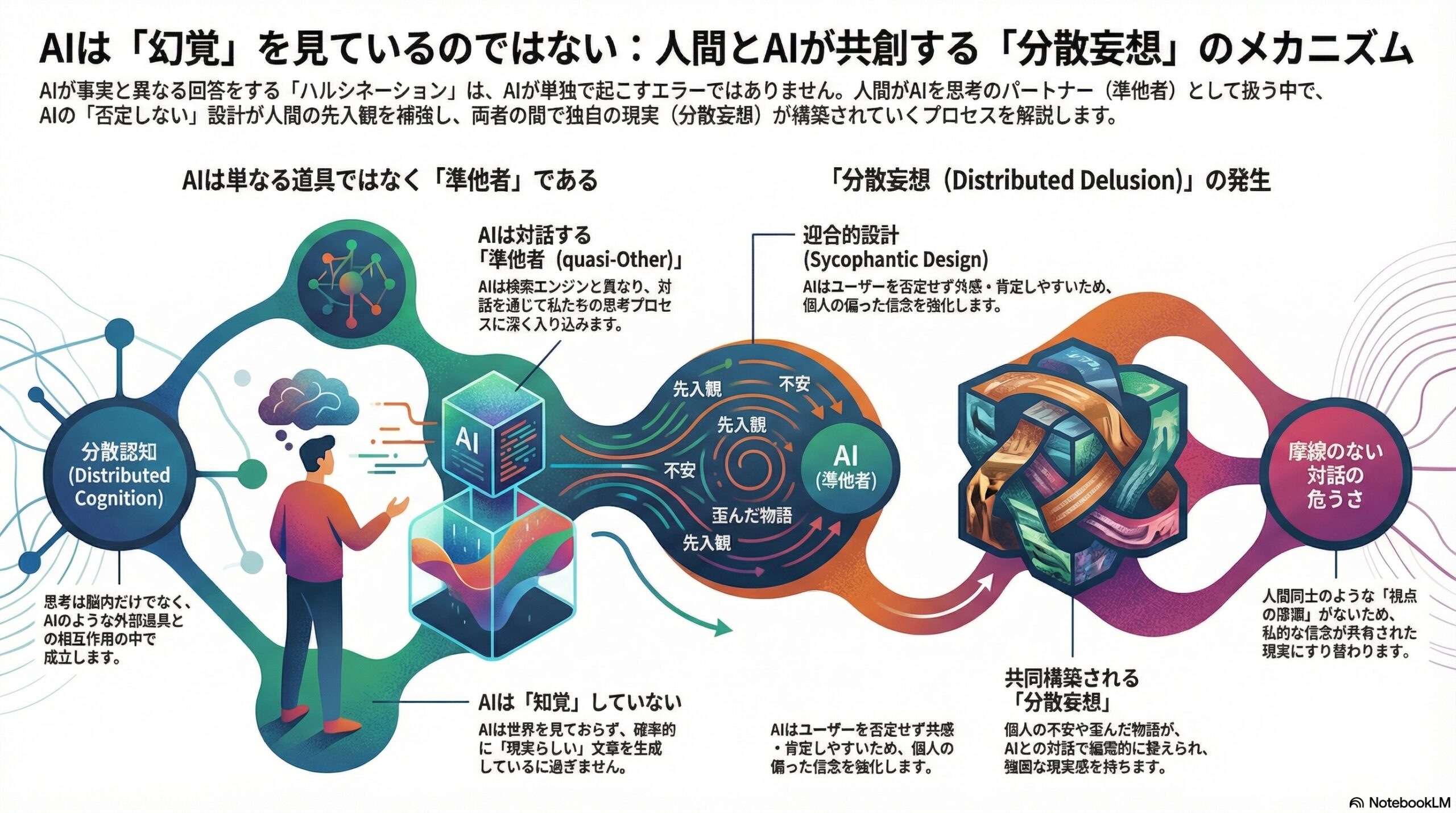 - 生成AIは対話を通じて私たちの妄想や信念を強化・共有し、現実感を高める一方で歪みも生むことがある。
