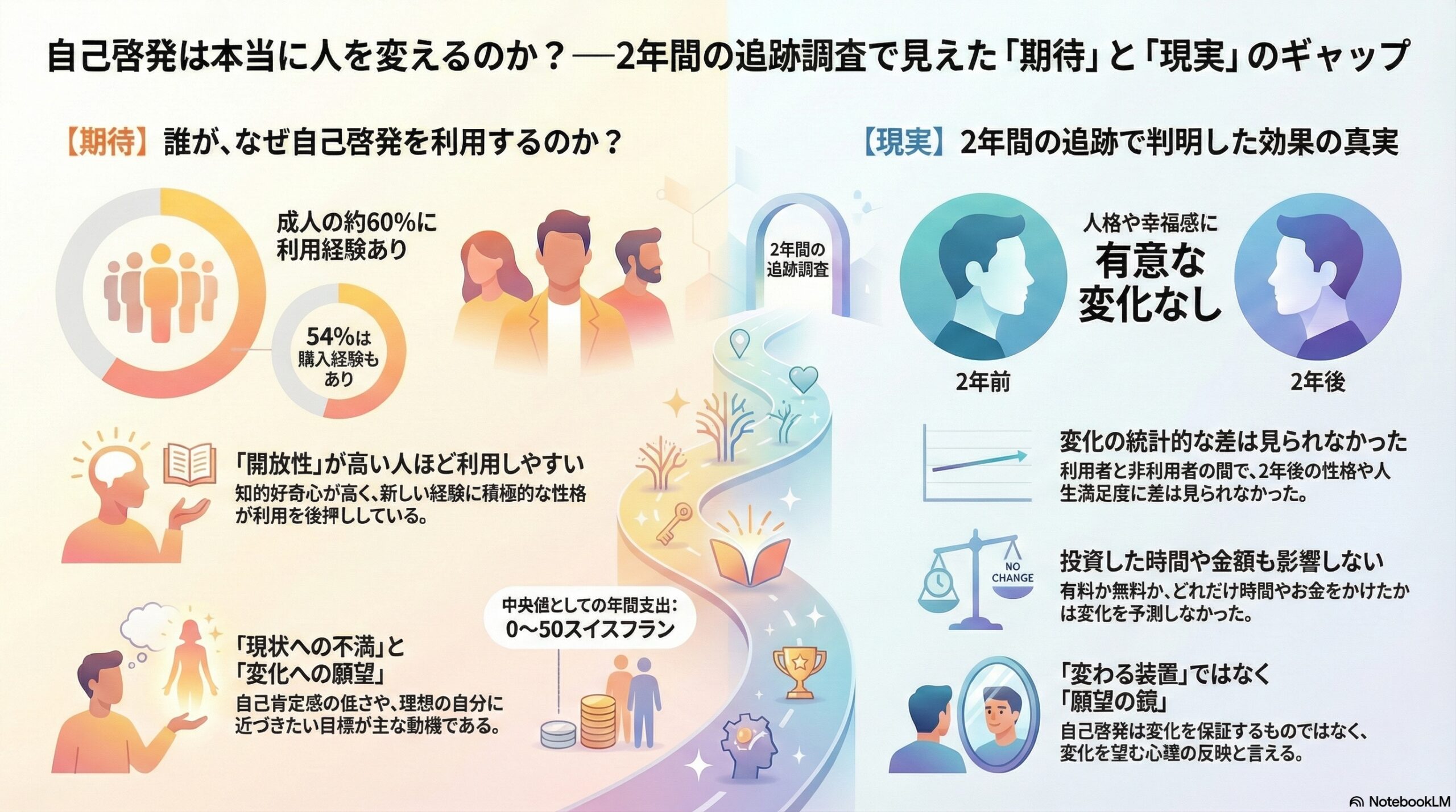 - 2年間の追跡では、自己啓発を使った人と使わなかった人で人格や幸福感が変わる差は見られず、効果ははっきりしていなかった。
