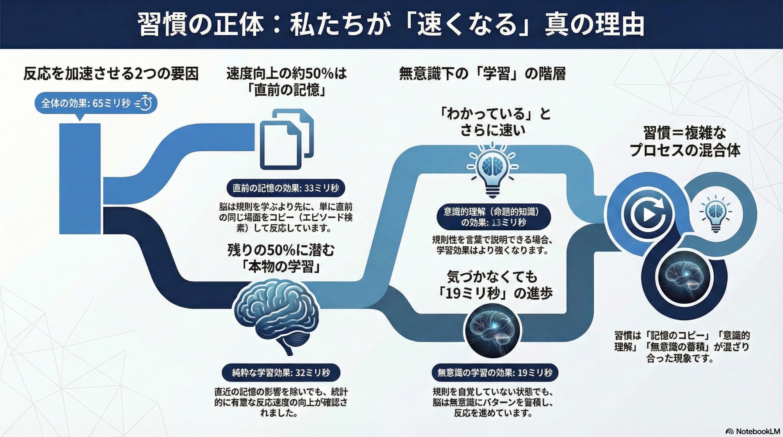 - 直前の記憶を統計的に除いても残る学習効果があり、意識して理解している場合ほど強く、無意識の学習がある可能性も示されました。