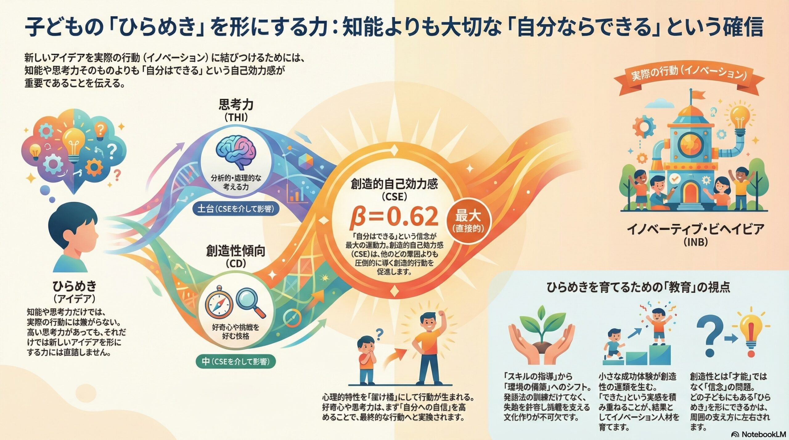 - 思考力や創造性の数値よりも、この「自分はできる」という感覚が行動へつながる強い予測因子でした。