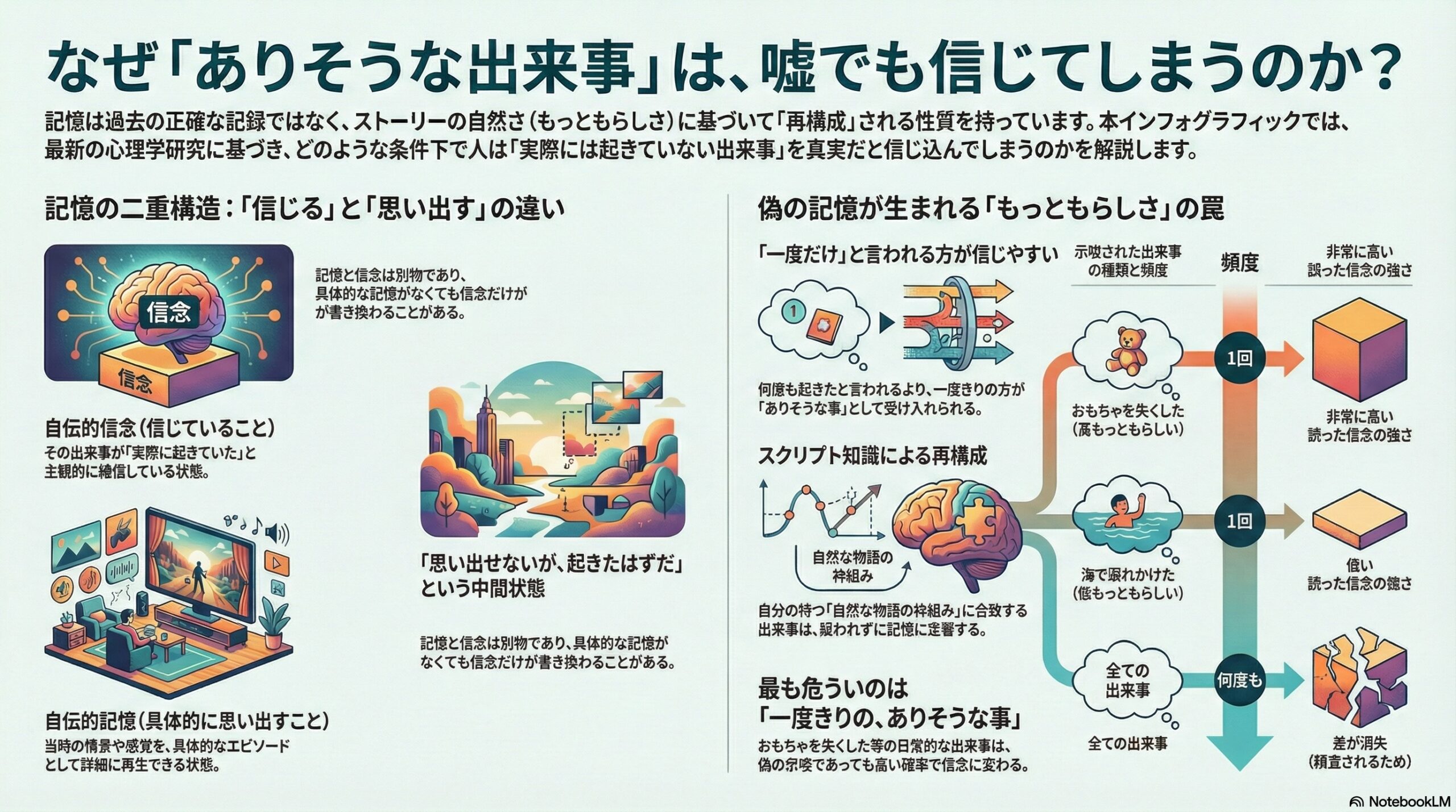 - 記憶はただの保存ではなく再構成され、起きていない出来事を起きたと信じてしまうことがある。