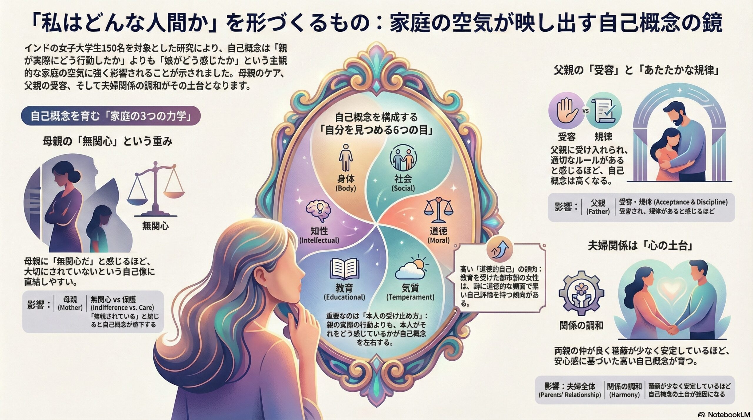 - 親の“受け止め方”が自己概念に影響し、母親が無関心と感じるほど自己概念は低く、父親の受容と適度な規律、さらに夫婦関係の調和が高いほど自己概念が高くなる傾向がありました。