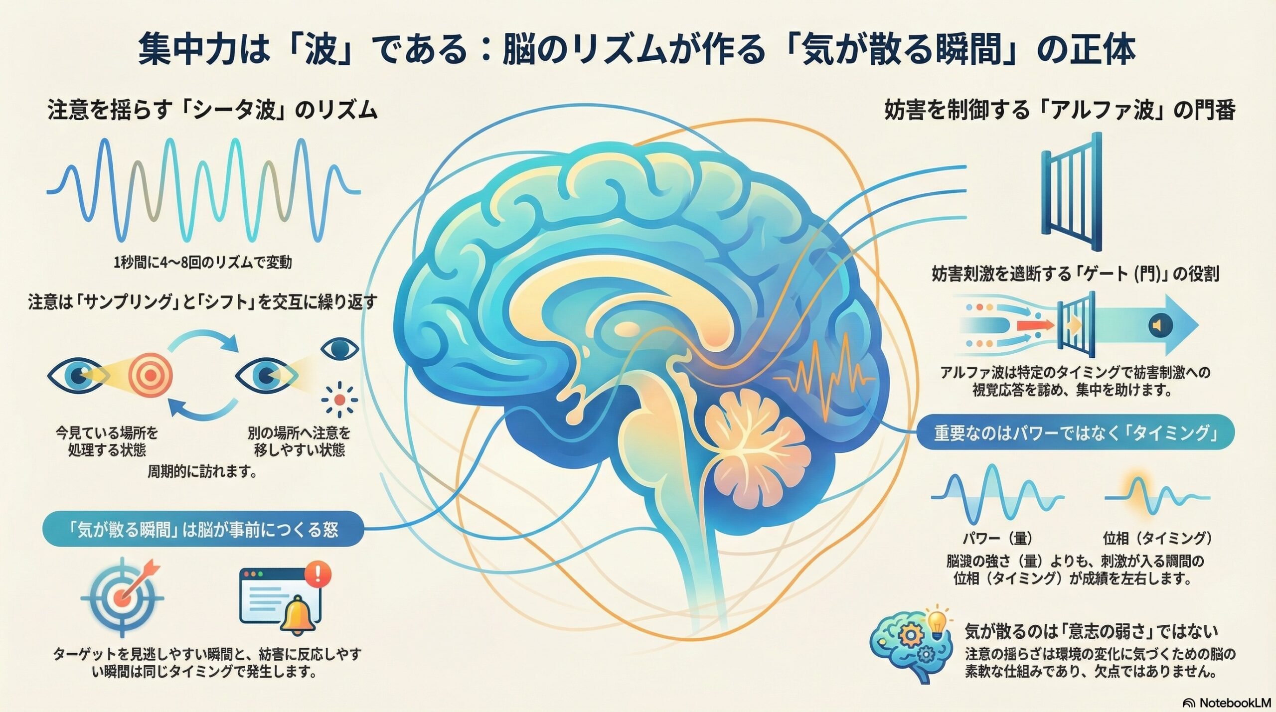 これは、アルファ波が妨害刺激を“ゲート(門)”のように制御していることを示唆しています。