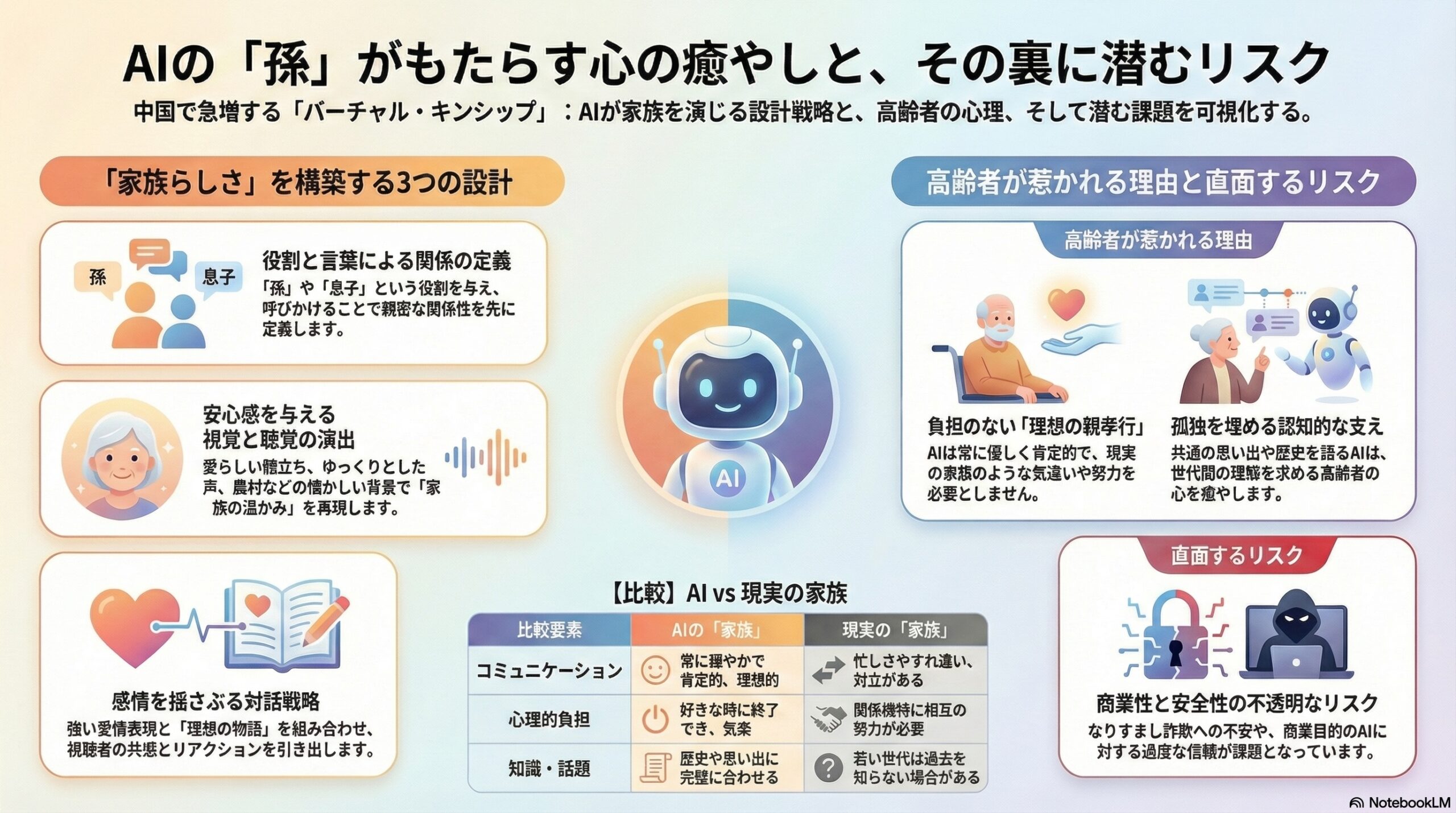 • 中国のショート動画でAIが「孫」や「息子」などの家族役を演じるインフルエンサーが広がり、研究は224本を分析して「バーチャル・キンシップ」と呼ぶ現象を伝えています。