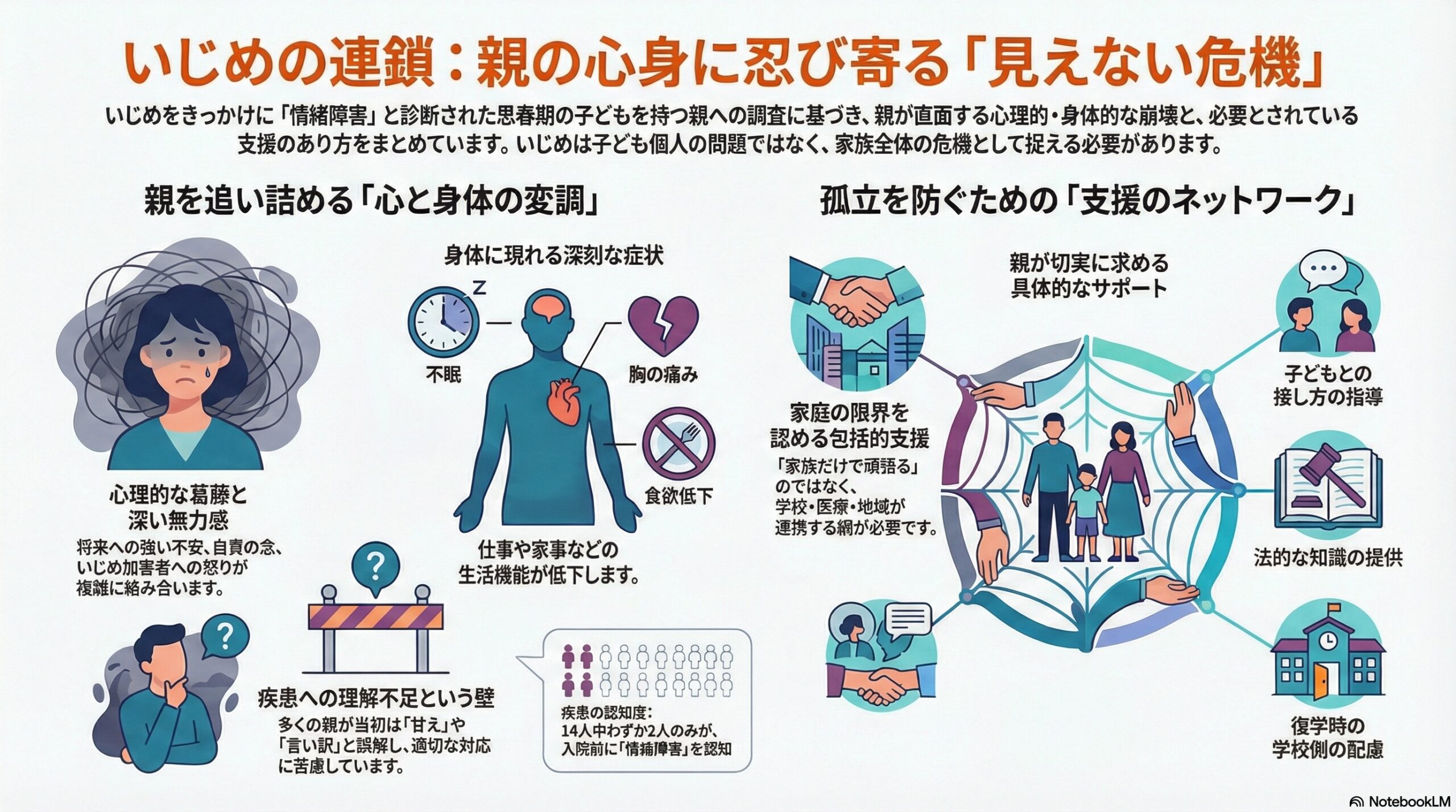 この研究は、いじめをきっかけに情緒障害を発症した思春期の子どもをもつ親の体験に焦点を当てた質的研究です。親たちへのインタビューを通して、子どもの病気をどう理解し、どう反応し、その過程で自分自身がどのように追い込まれていくのかを丁寧に描き出しています。