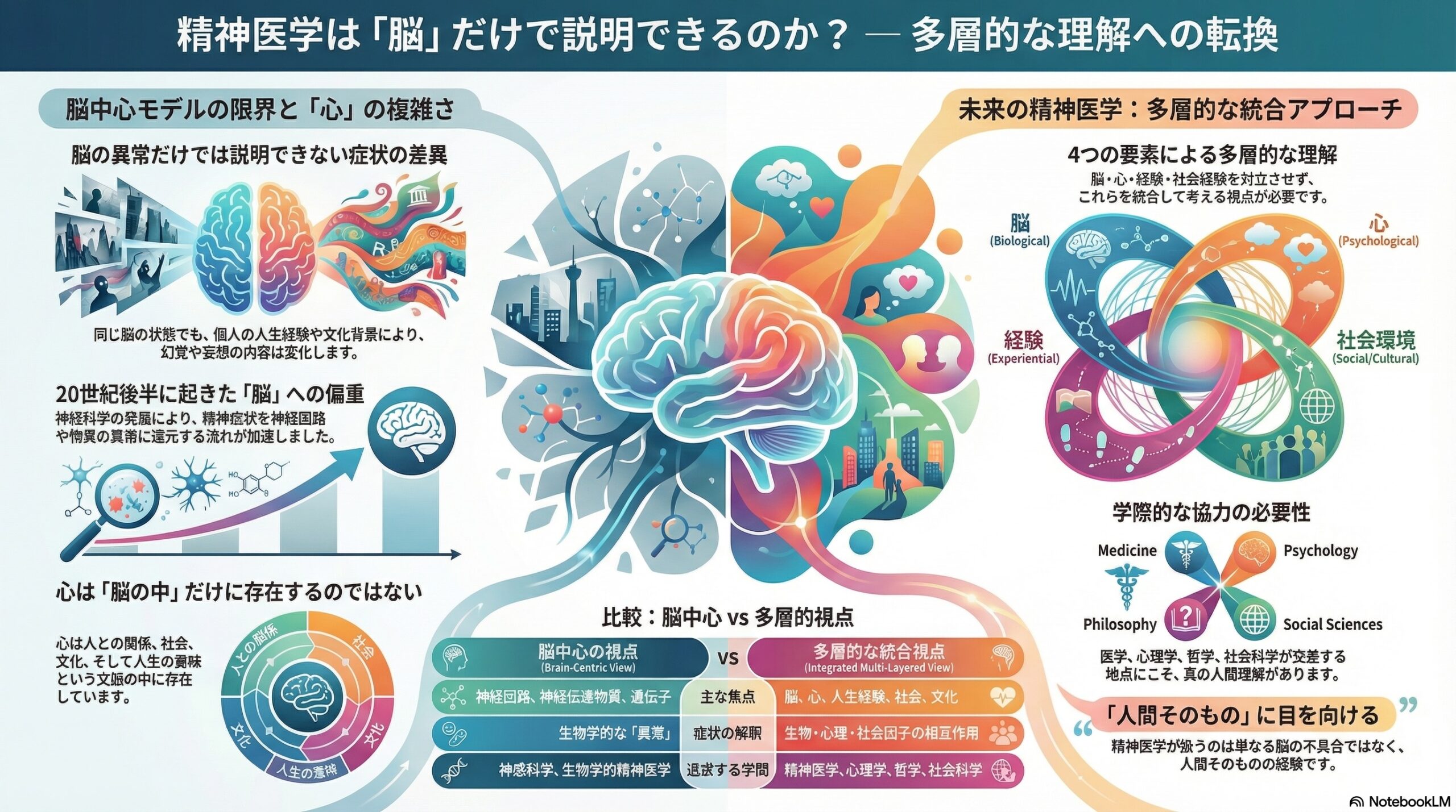 - 脳だけでは説明できない現象もあるので、脳・心・経験・社会環境を統合して理解する必要がある