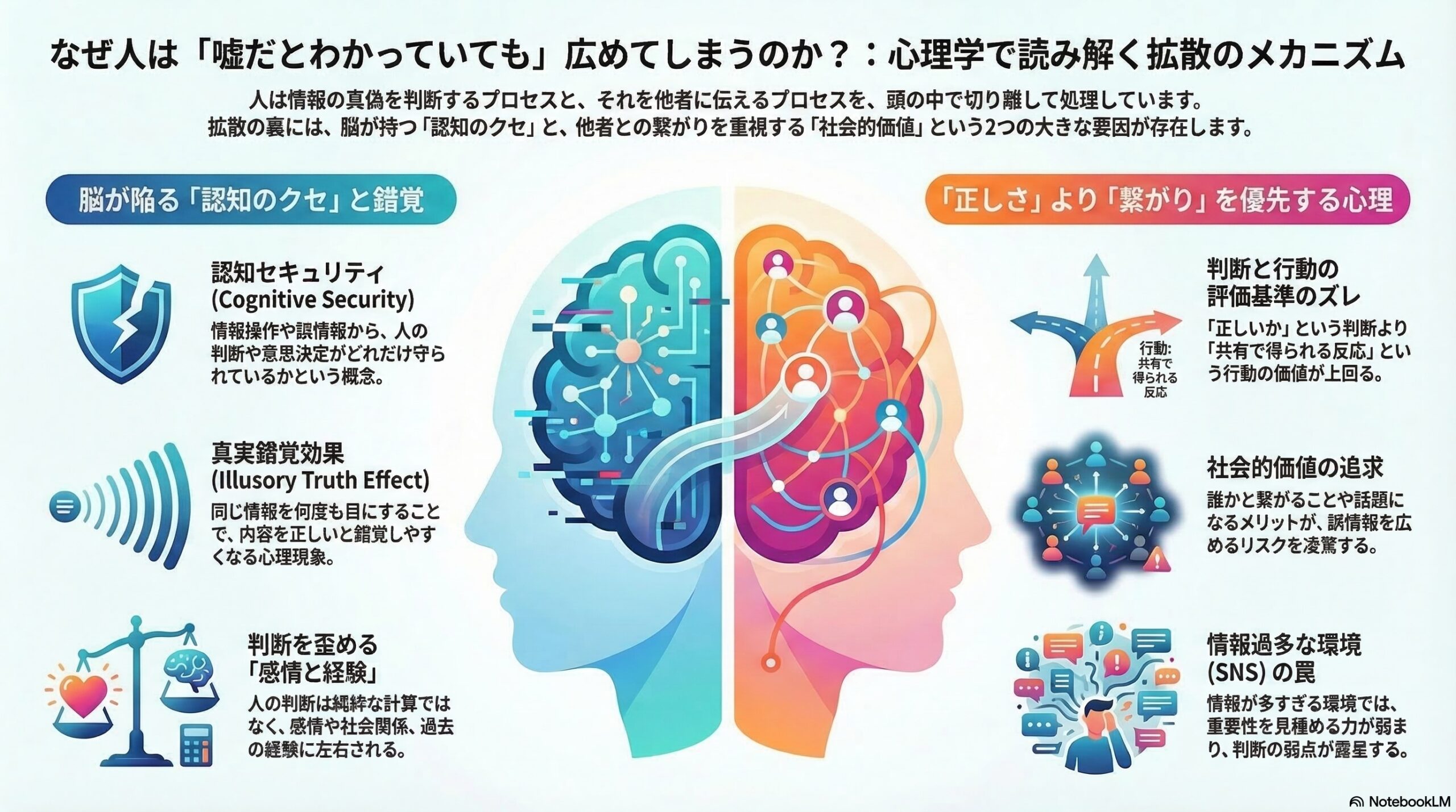 • 真実バイアスや情報過多の環境など、判断の偏りは人間の仕組みの副作用かもしれず、欠陥ではないと考えられる。