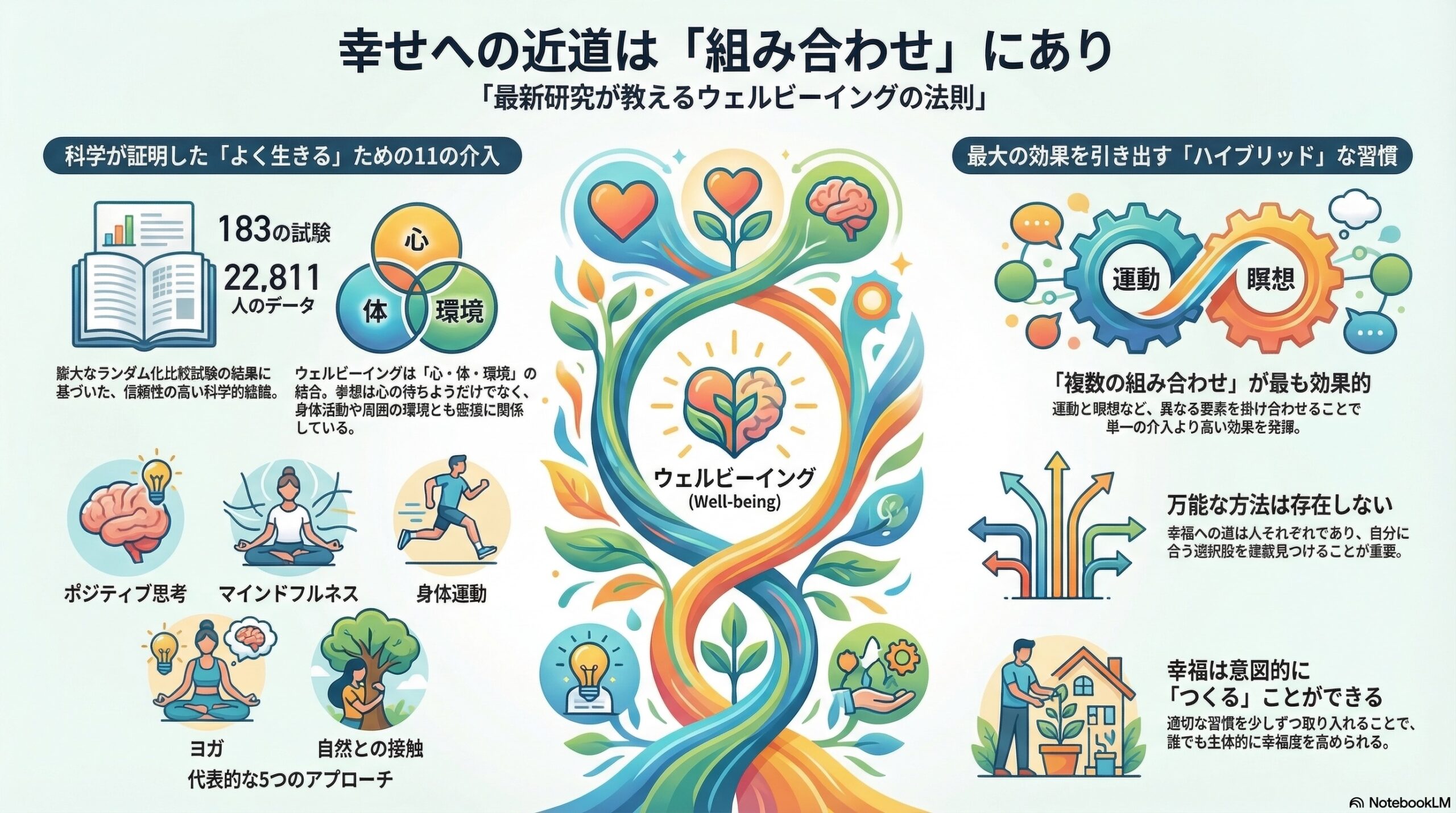 対象となったのは、病気の治療ではなく、一般の成人のウェルビーイングを高める介入です。