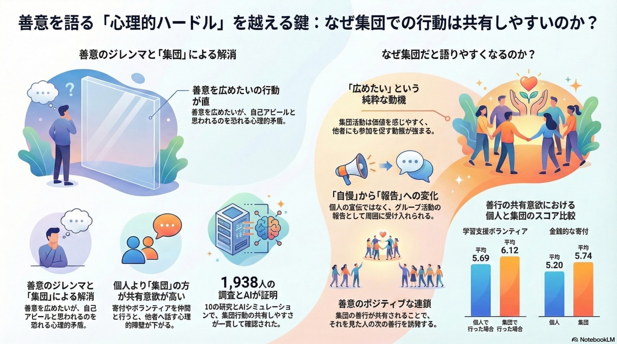 つまり、集団で行う善行は、善意を語る心理的なハードルを下げる可能性があるのです。