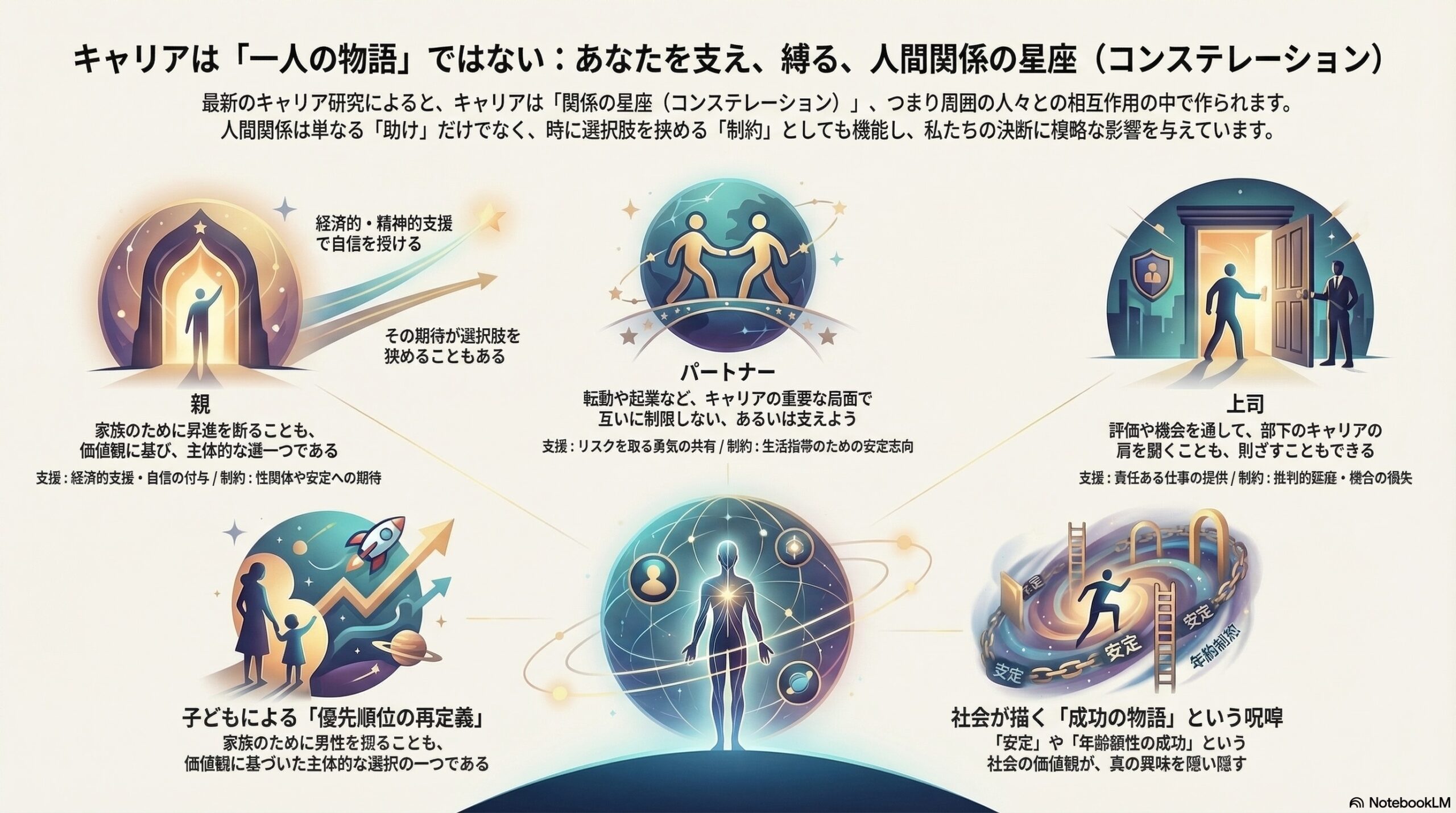 研究者たちは、その回答をテーマごとに分析し、人間関係がどのようにキャリアに影響しているのかを整理しました。