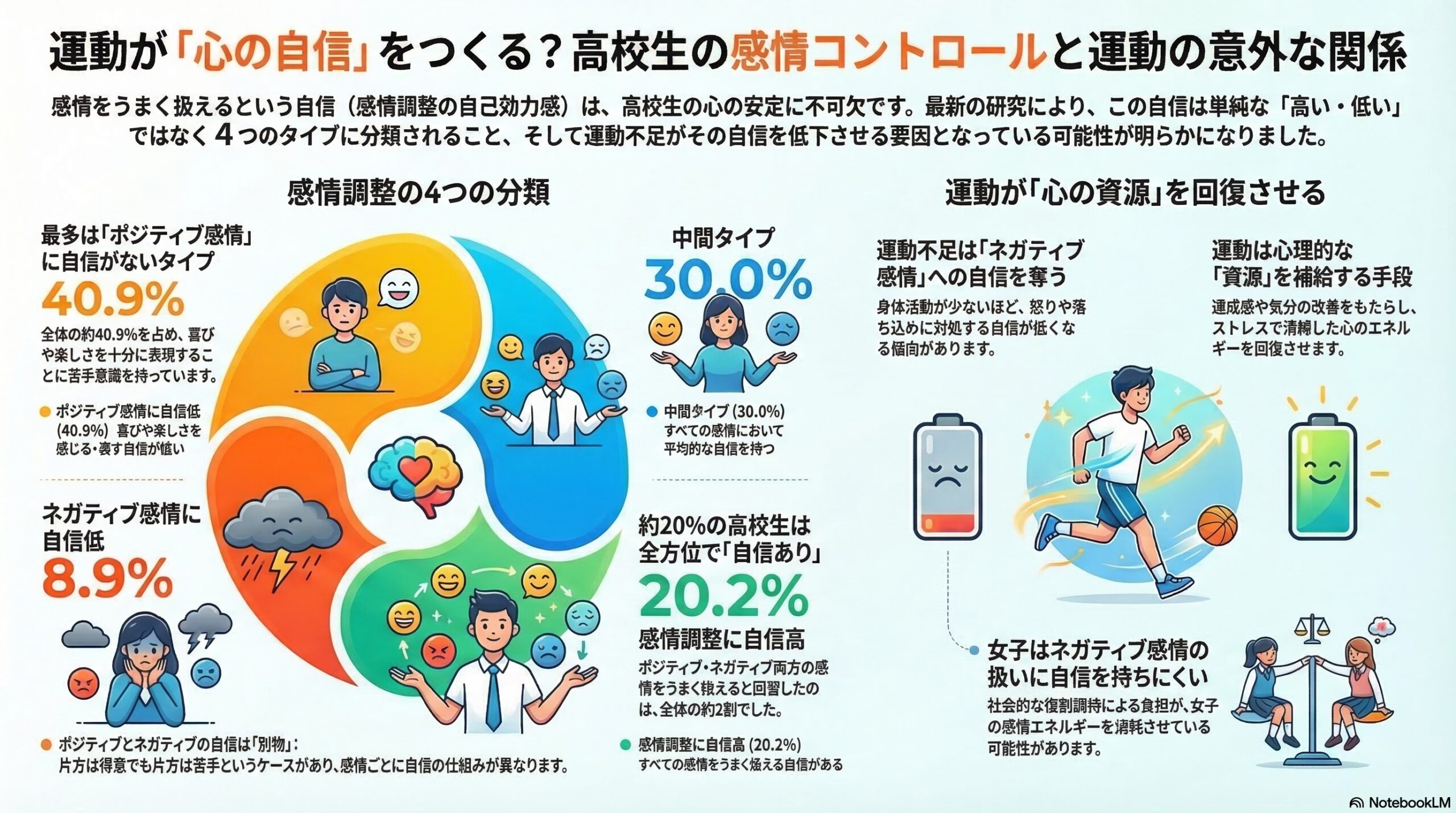 今回の研究は、この「感情をコントロールできるという自信」が高校生の中でどのようなタイプに分かれるのか、そして運動習慣と関係しているのかを調べました。