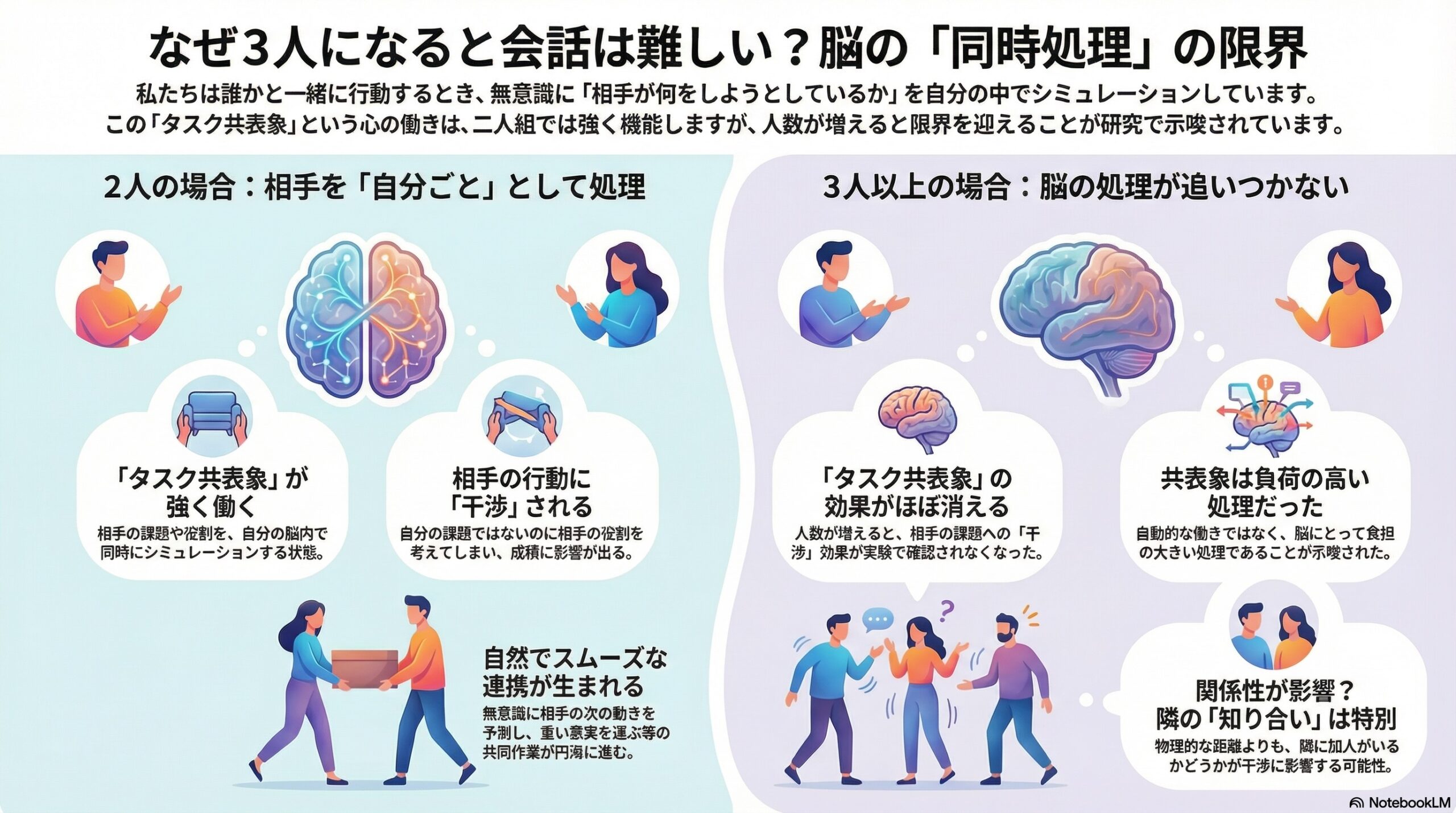 - 二人までは相手の役割を同時に頭の中に取り込む「タスク共表象」が働くが、三人以上では起こりにくくなる。