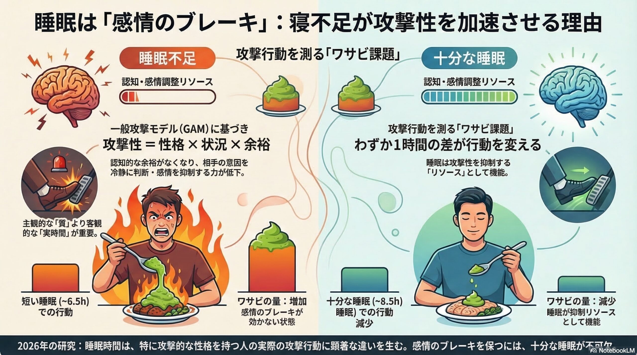 - 睡眠時間が十分だと、攻撃的な性格の人ほど攻撃行動が減る可能性がある。
