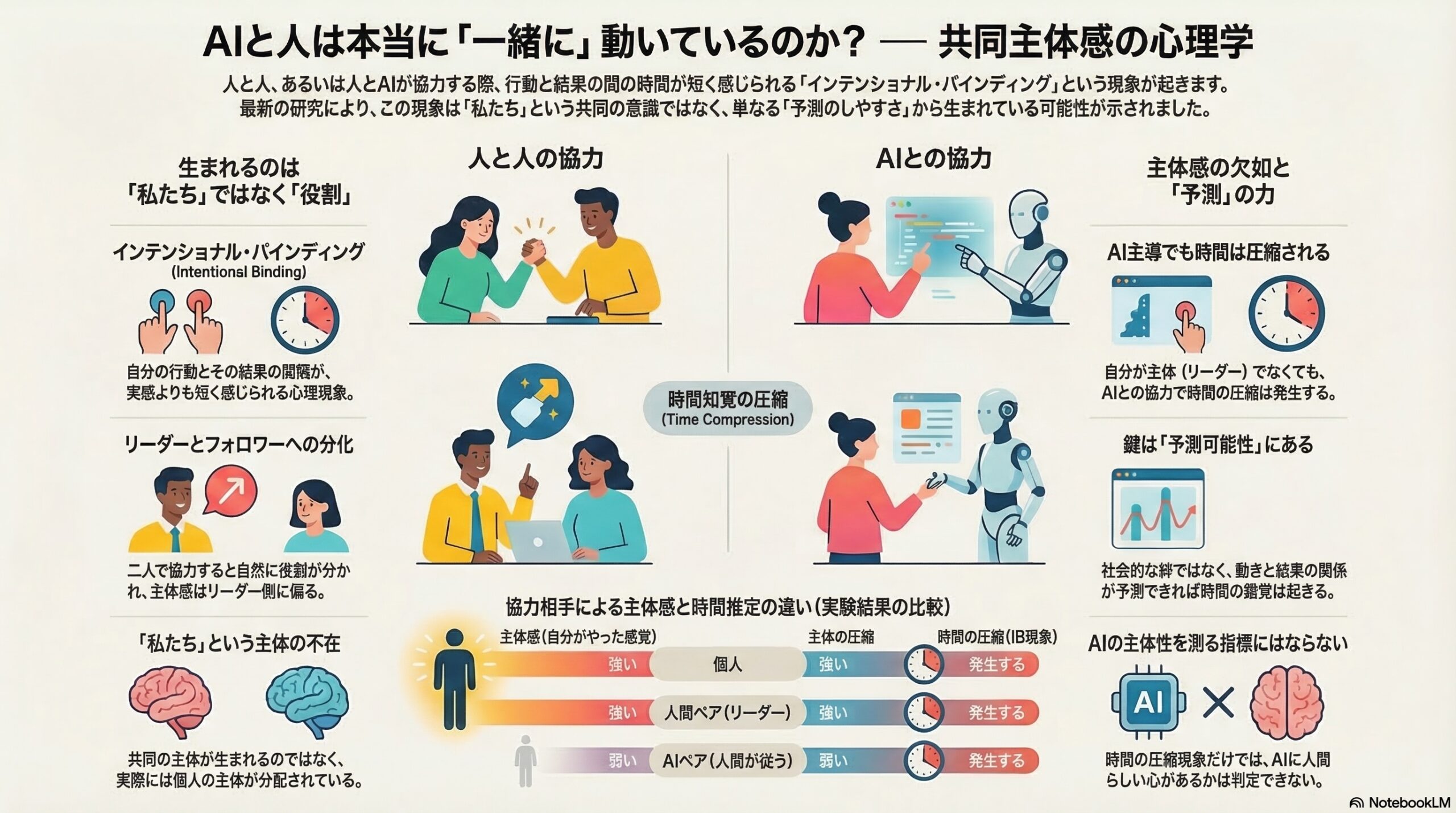- インテンショナル・バインディングは主体感よりも、行動と結果の予測可能な関係によって起きる現象で、AIと人の協力でも同じような効果が見られた。