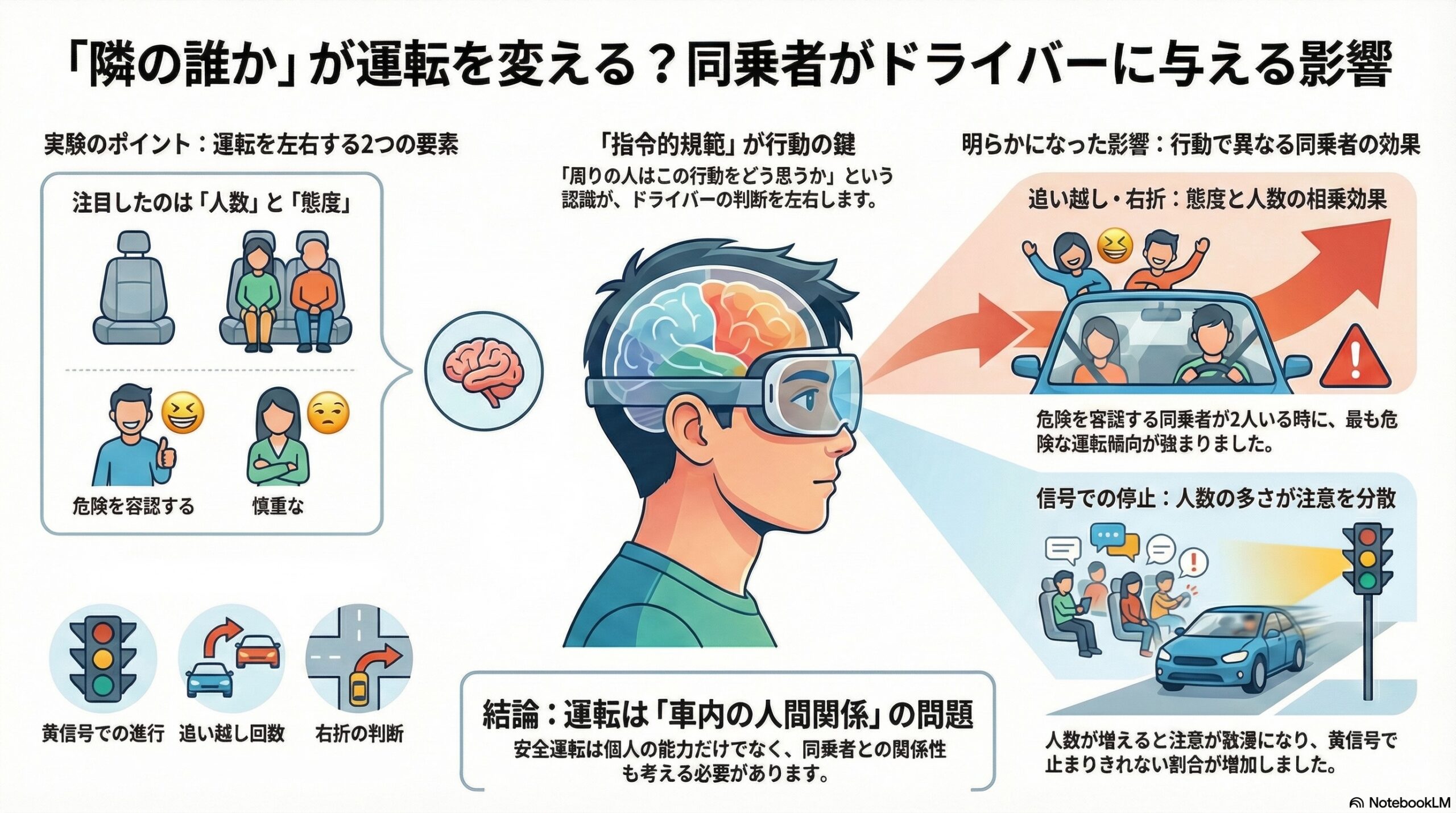 この研究は、危険運転を「ドライバー個人の性格や能力」の問題としてだけでなく、「同じ車内にいる人との関係性」の中で捉える必要があることを示しています。