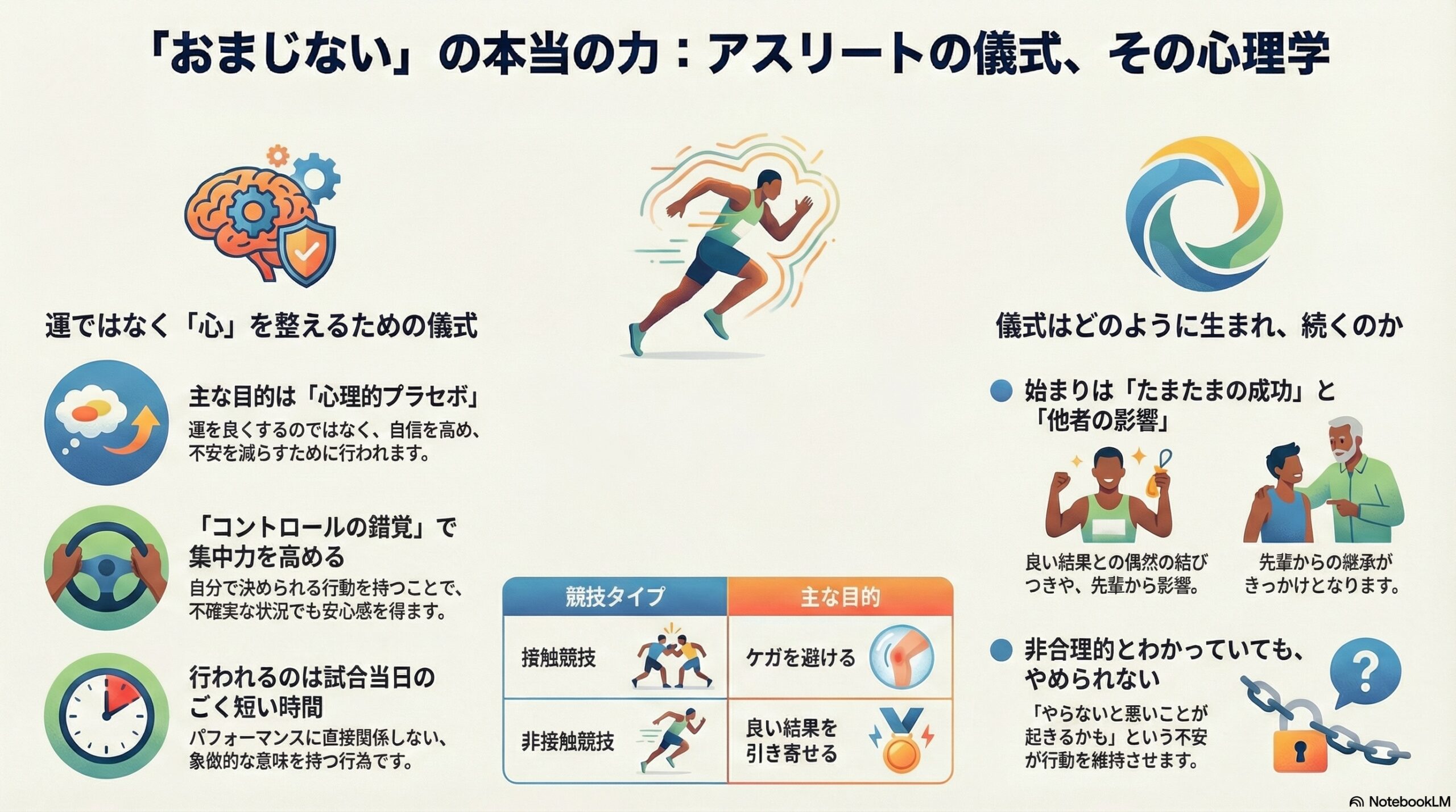 - 迷信的儀式は運を整えるよりも、自信を高めたり不安を減らしたり、心をコントロールしていると感じさせる心理的効果だと分かった。