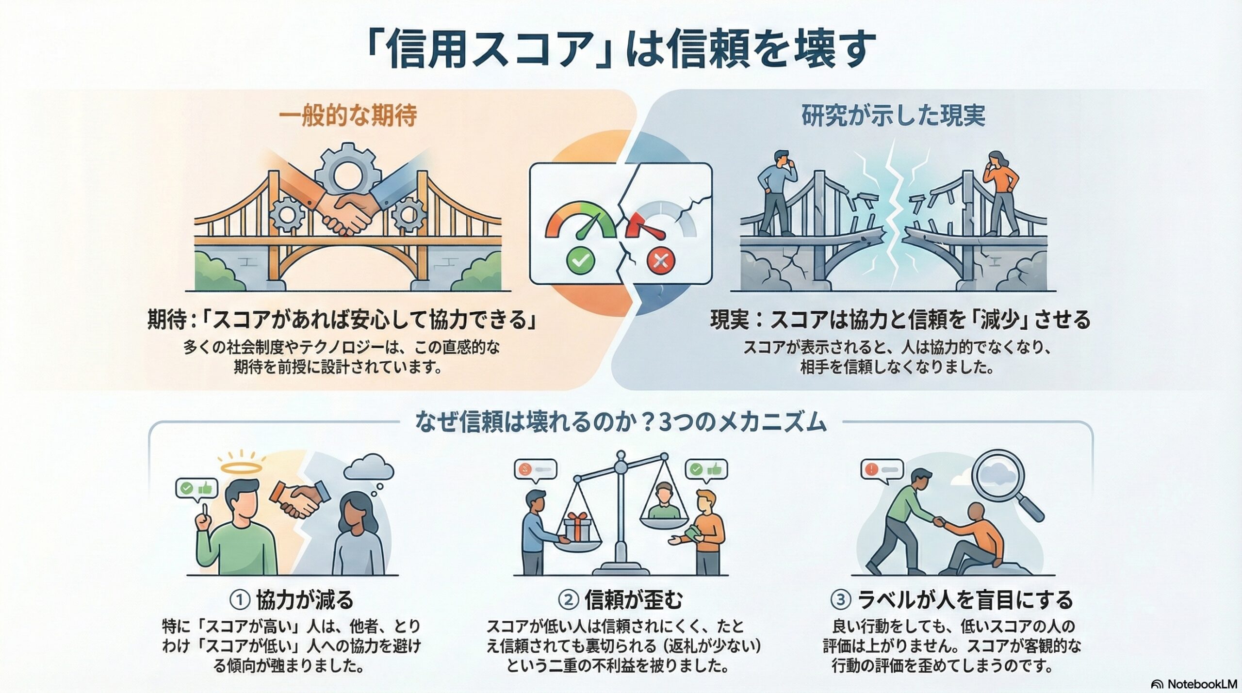 社会的信用スコアが可視化されると、人は協力しなくなり、信頼しなくなり、しかもその傾向は「信用が高い側の人」ほど強くなるのです。