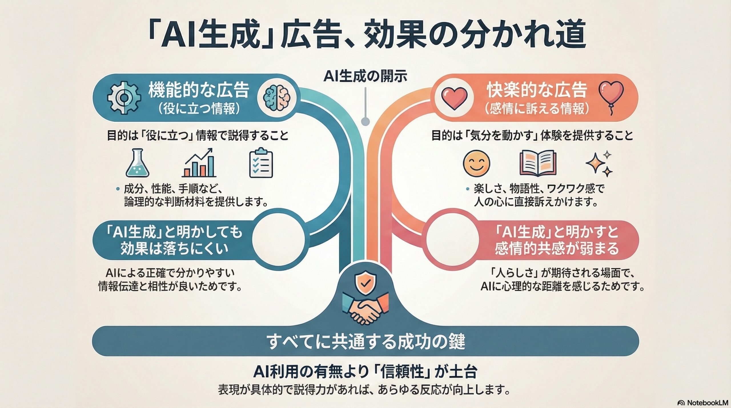 ポイントは、「広告の中身の種類」と、「共感(エンパシー)」、そして「AIが作ったと明かすこと」です。