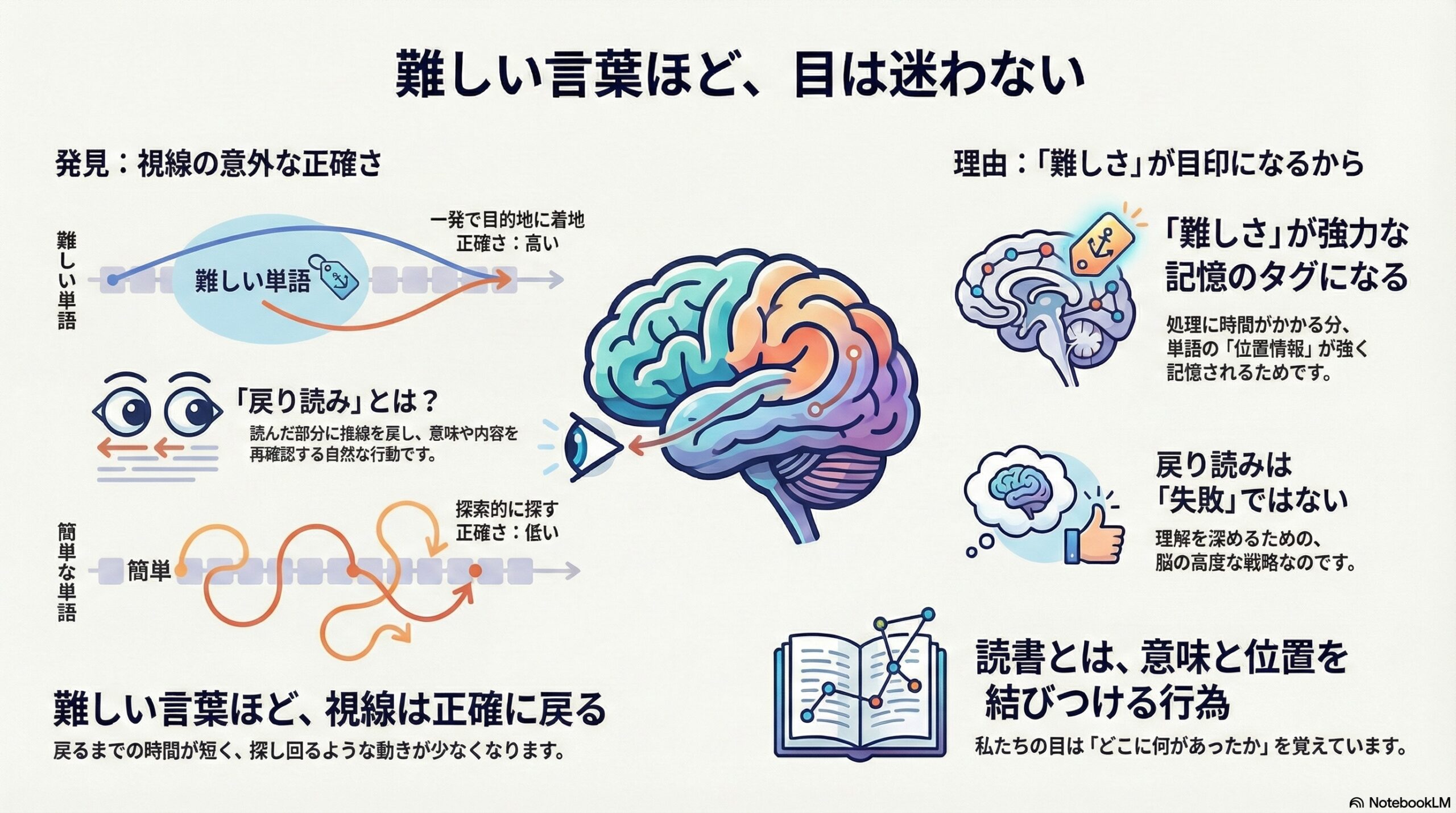 - 難しい語は「場所の記憶」が強く残り、戻り読みが理解を深める仕組みとして働く。